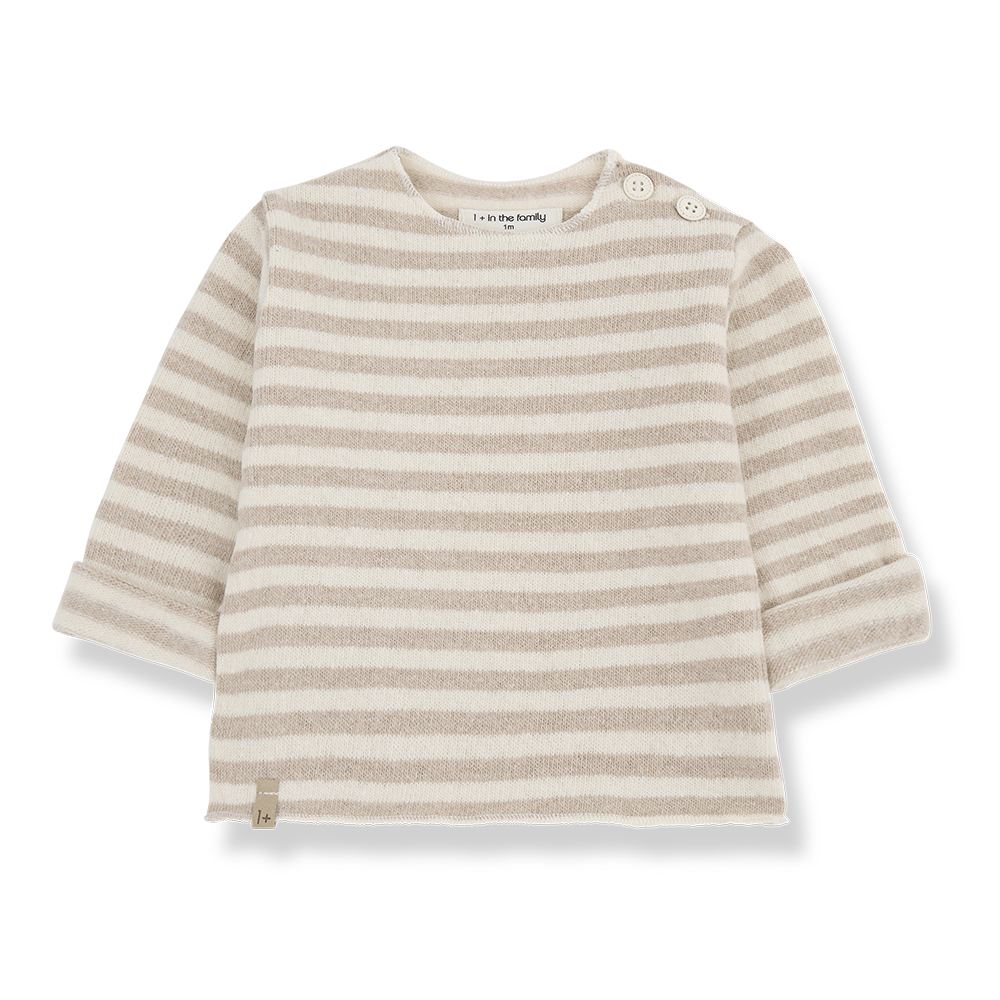 Heerlijk zachte longsleeve Aubin in de kleur Beige van het mooie merk 1+ in the Family. Het truitje is gemaakt van een zachte katoen fleece waardoor het heerlijk zit. Op de schouder zitten knoopjes waardoor je het truitje makkelijk over het hoofdje van jouw kleintje krijgt. Combineer dit mooie streeptruitje met het leuke bijpassende beige broekje.