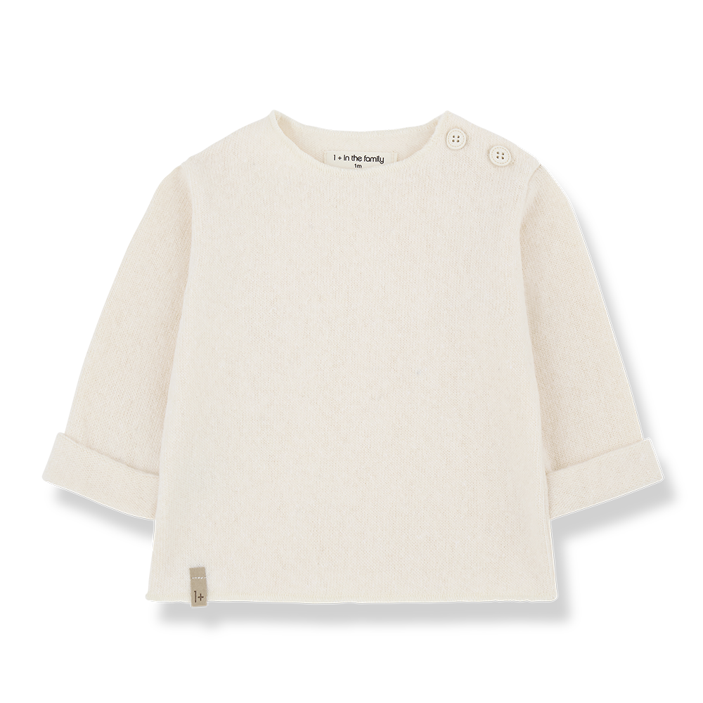Heerlijk zachte longsleeve Chapin in de kleur Ecru van het mooie merk 1+ in the Family. Het truitje is gemaakt van een zachte katoen fleece waardoor het heerlijk zit. Op de schouder zitten knoopjes waardoor je het truitje makkelijk over het hoofdje van jouw kleintje krijgt. Combineer dit mooie truitje met het leuke bijpassende ecru broekje.