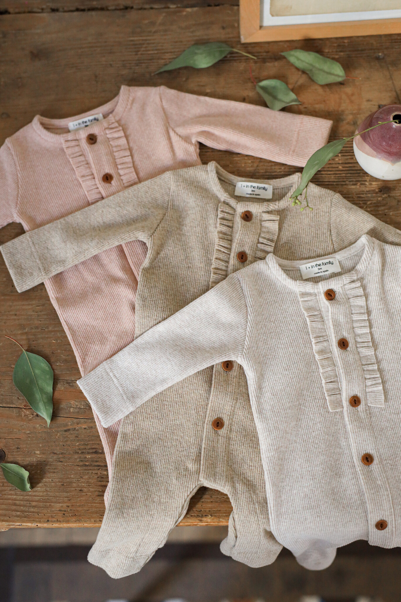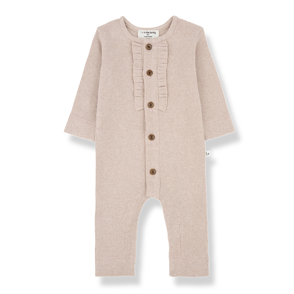 Heerlijke zachte newborn jumpsuit Elsa in de kleur Nude van het mooie merk 1+ in the Family. De jumpsuit is gemaakt van een zachte dikke rib jersey. Tussen de beentjes zitten drukkertjes waardoor je jouw kindje makkelijk kunt verschonen. De jumpsuit is prachtig uitgewerkt met een mooie sluiting aan de voorkant, houten knoopjes en een mooi merklabeltje.