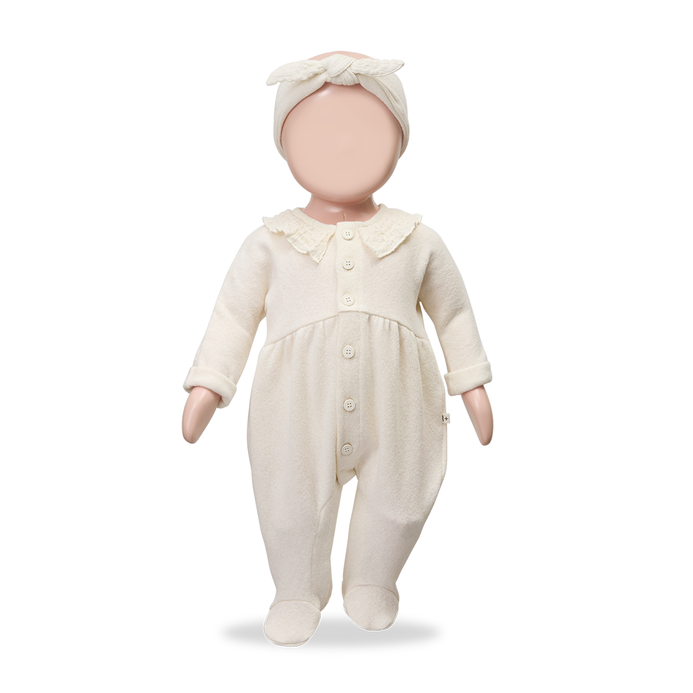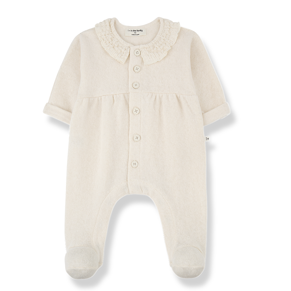 Hele zachte jumpsuit Helen in de kleur Ecru van het mooie merk 1+ in the Family. Het pakje is gemaakt van zachte katoen fleece waardoor het heerlijk zit. De jumpsuit is voorzien van voetjes waardoor je geen sokjes nodig hebt. De mooie kraag en leuke vormgeving maken dit pakje extra bijzonder. Tussen de beentjes zitten drukkertjes waardoor je jouw kindje makkelijk kunt verschonen. Een prachtig newborn pakje.
