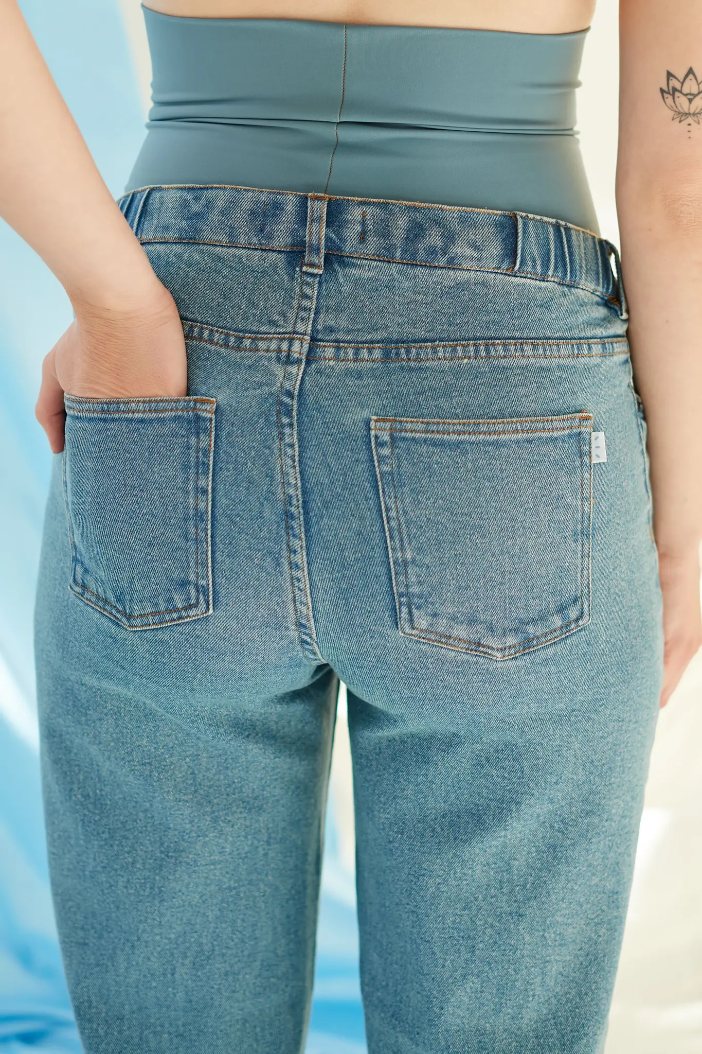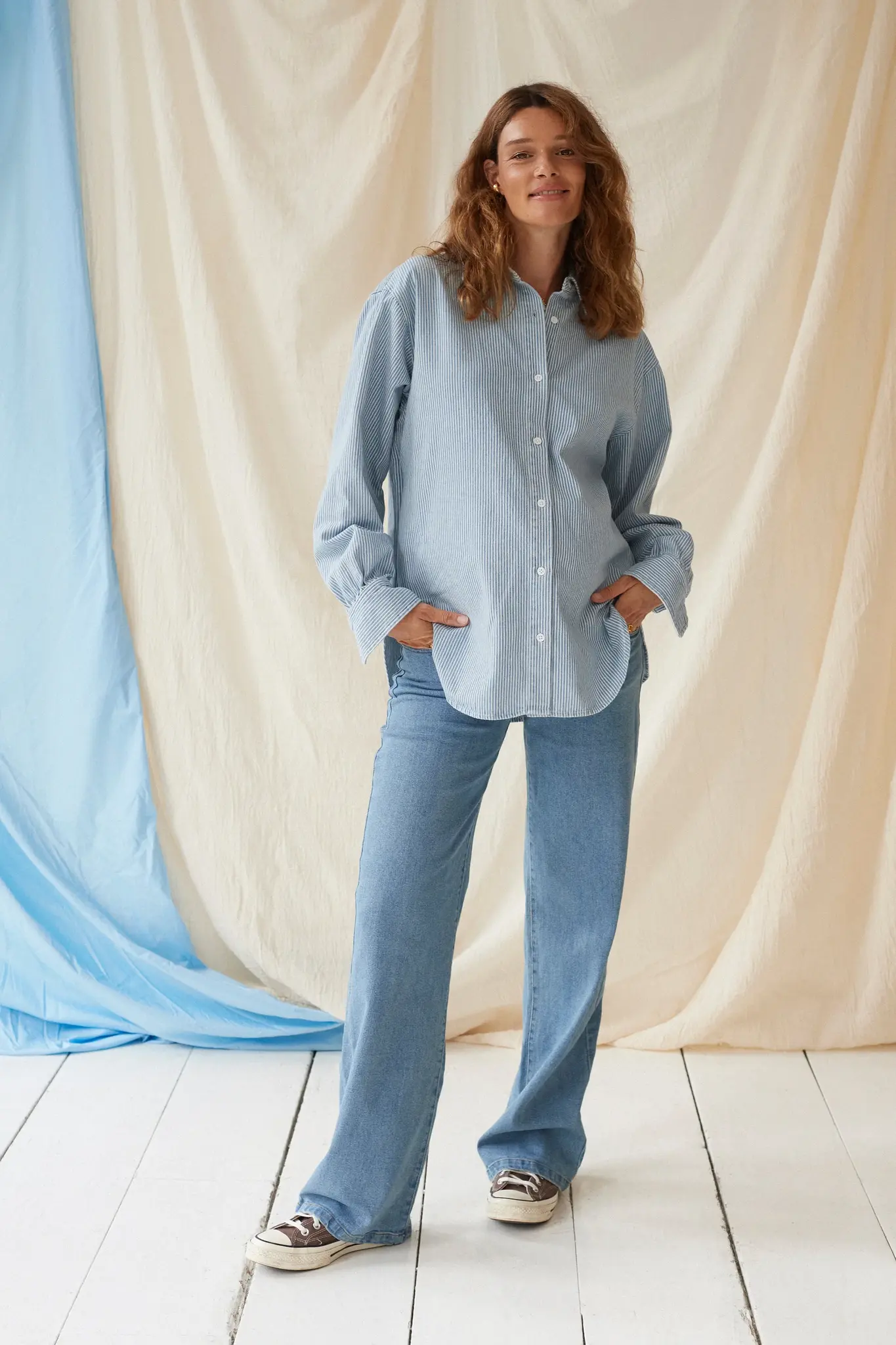 Een prachtig positie wideleg denim in light blue van het mooie Nederlandse merk Atelier Melon. De jeans is gemaakt van zachte katoen denim met een beetje elastan voor het comfort. De hoogwaardige kwaliteit blijft mooi ook na vele wasbeurten. De tailleband is gemaakt van een stevig stretch doek die de groeiende buik en je rug ook echt ondersteunt. Dus niet zomaar een tricotband. De broek is zo ontworpen dat het echt voelt alsof je een normale jeans aan hebt. Met het enige verschil dat er nu een prachtige zwangere buik in past.