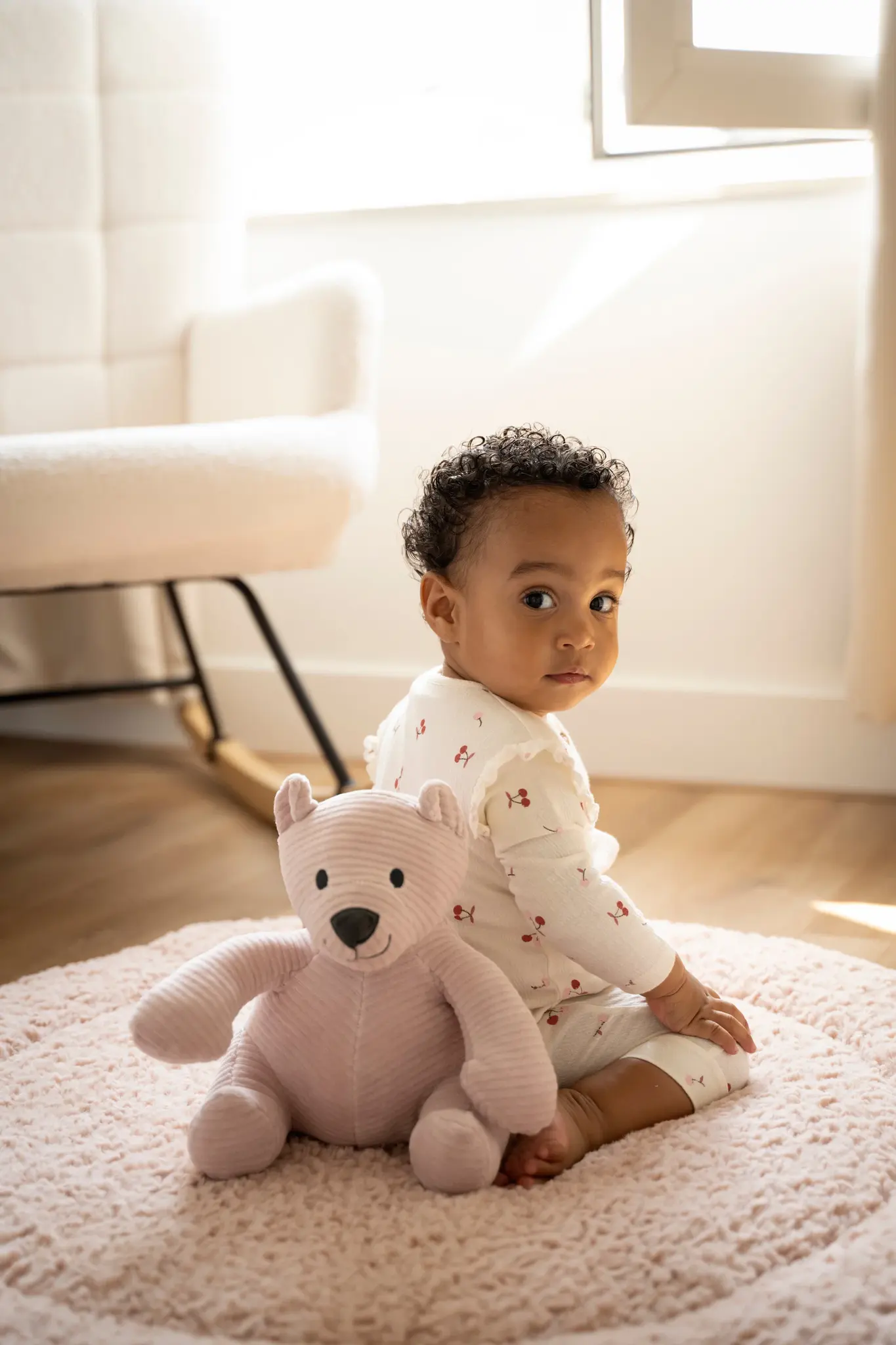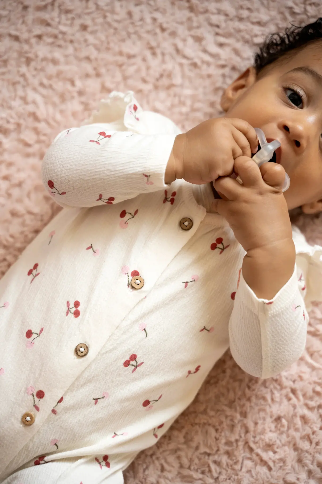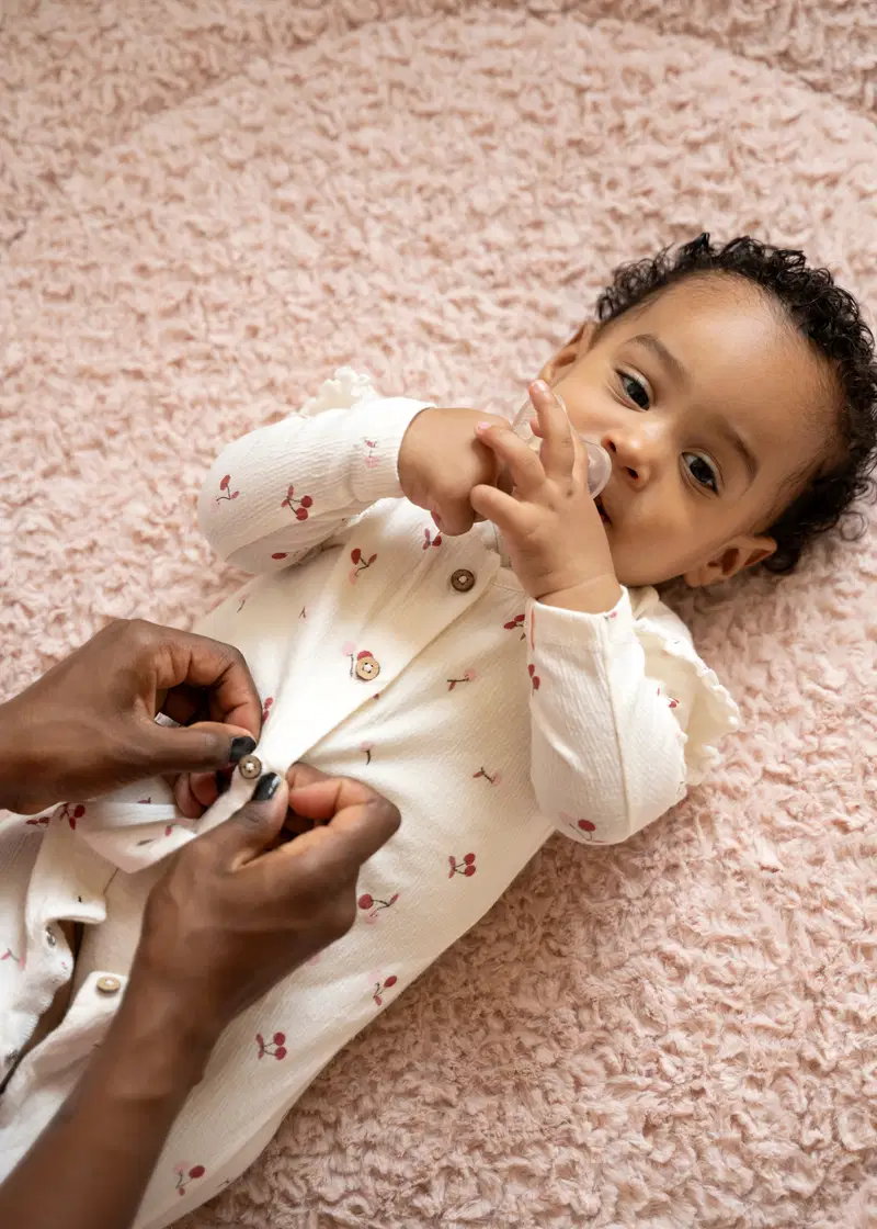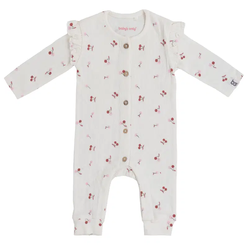 Stijlvol boxpak in de kleur cherry cream van het leuke Nederlandse merk Baby's Only. Het boxpakje is gemaakt van een mix van biologische katoen met elastan waardoor het heel comfortabel zit. Het pakje is leuk uitgewerkt een patroontje van allemaal kleine kersjes, ruches en mooie houten knoopjes. Tussen de beentjes zitten drukkertjes zodat je jouw kleintje makkelijk kunt verschonen.