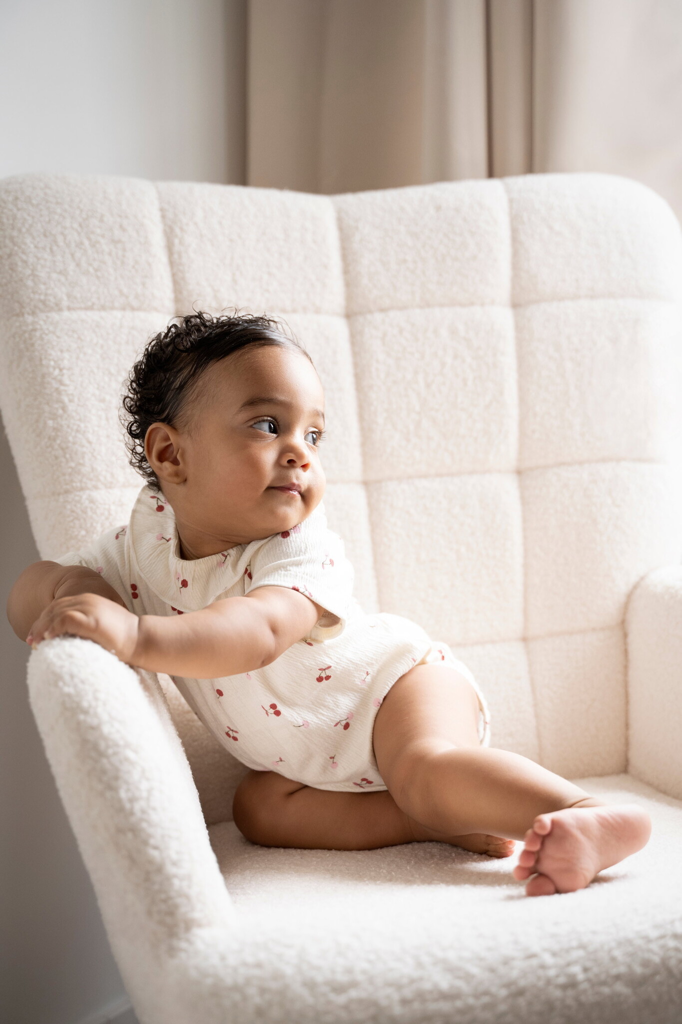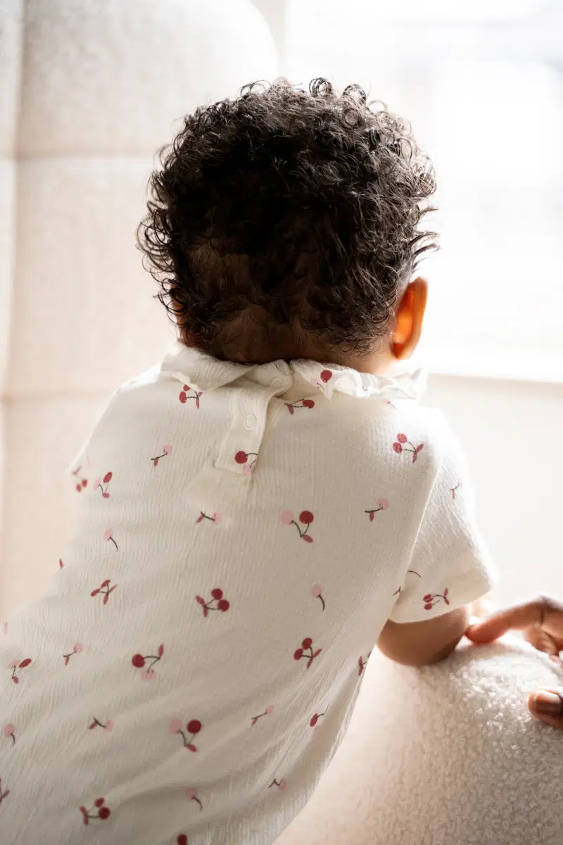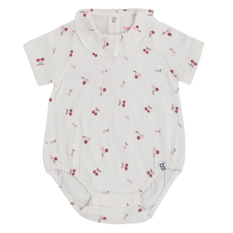 Stijlvolle romper in de kleur cherry cream van het leuke Nederlandse merk Baby's Only. Het rompertje is gemaakt van een mix van biologische katoen met elastan waardoor het heel comfortabel zit. Het rompertje is leuk uitgewerkt een patroontje van allemaal kersjes en een leuk kraagje. Tussen de beentjes zitten drukkertjes zodat je jouw kleintje makkelijk kunt verschonen.