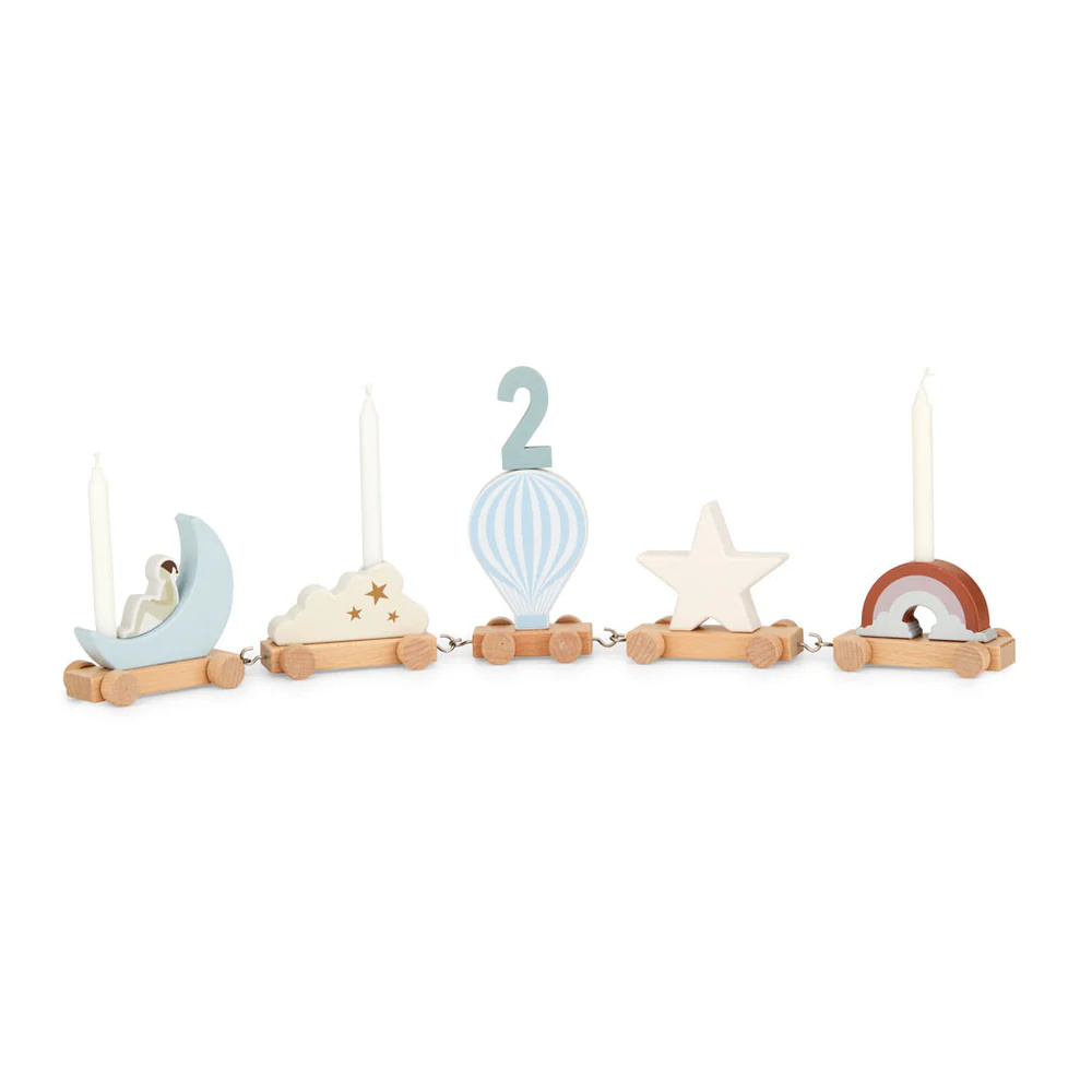 Een prachtige verjaardagstrien Dreamland van het Deense merk Cam Cam Copehangen. Vier de speciale dag van je kind met deze charmante FSC-gecertificeerde verjaardagstrein. De trein is gemaakt van mooi hout en geverfd met natuurlijke verfstoffen. Hij is voorzien van vijf iconische Cam Cam-elementen uit het geliefde Dreamland-thema: een ster, een wolk, een regenboog, een maan met een kind erop en een luchtballon. Verbind de onderdelen met metalen haken om elk jaar een unieke opstelling te creëren.