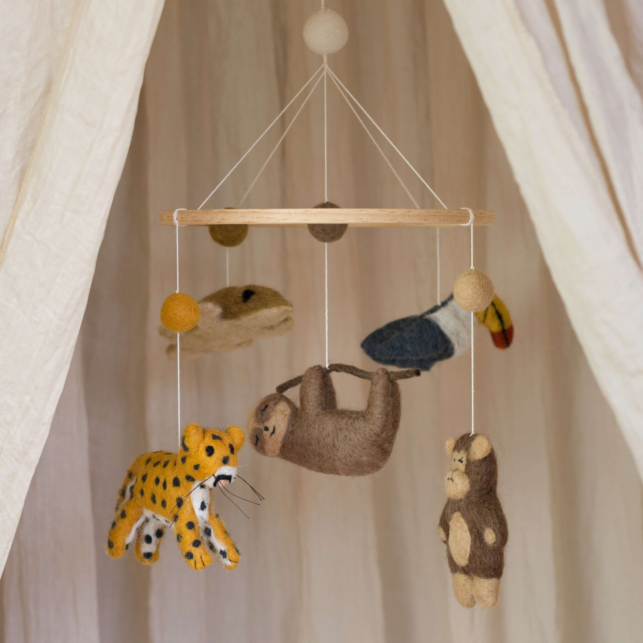 Een prachtige Jungle baby mobiel van het leuke Nederlandse merk Baby Bello. De mobile is ontworpen om jouw kleintje te helpen ontspannen. Het is een prachtig product om boven het bedje of de box van jouw kleintje te hangen. De mobile bestaat uit een serie schattige diertjes uitgevoerd in verschillende kleuren. Door de contrasten in vorm en kleur kan jouw kleintje heel wat zien.