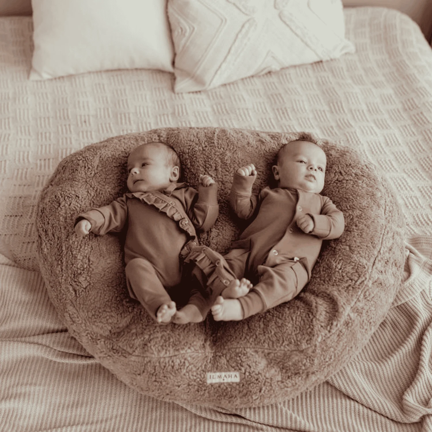 Samen met het Ilmaha voedingskussen voor tweelingen vormt deze hoes een geborgen nestje waarin je baby’s licht wegzakken en zich veilig en ontspannen voelen. De billetjes liggen iets lager dan het hoofdje, wat helpt om reflux te verminderen. De stof voelt zacht aan, maar is stevig genoeg om mooi in vorm te blijven.