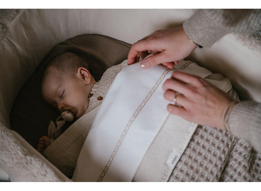 Een prachtig ledikantlaken fall in love in de kleur honeycrumb van het mooie Nederlandse merk Koeka. Alle ledikantlakens van dit mooie merk zijn gemaakt van 100% katoen en voelen daarmee lekker fris en crispy aan. De stof die Koeka gebruikt voor haar lakens is geweven van 100% katoen. Hierdoor zijn hun lakens zacht, luchtdoorlatend en duurzaam. Dit lakentje combineert perfect met verschillende ledikantdekens van Engel, Alwero of Klippan. Door de kleine geborduurde rand op dit laken kan je de wieg van je baby extra mooi maken.