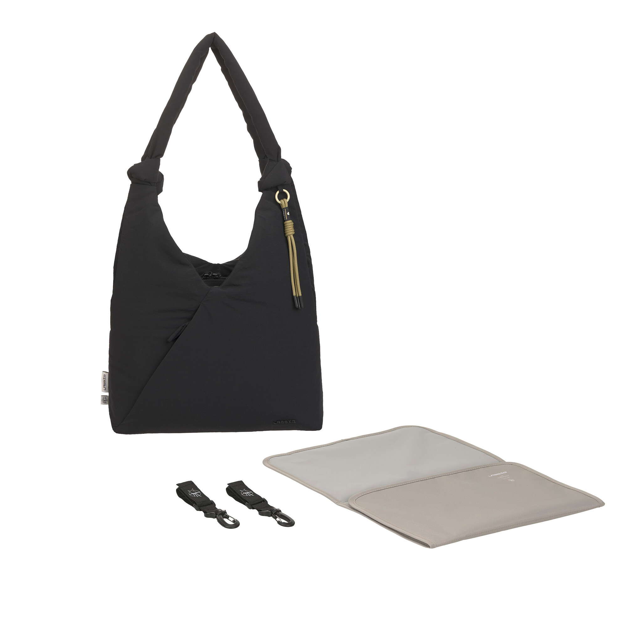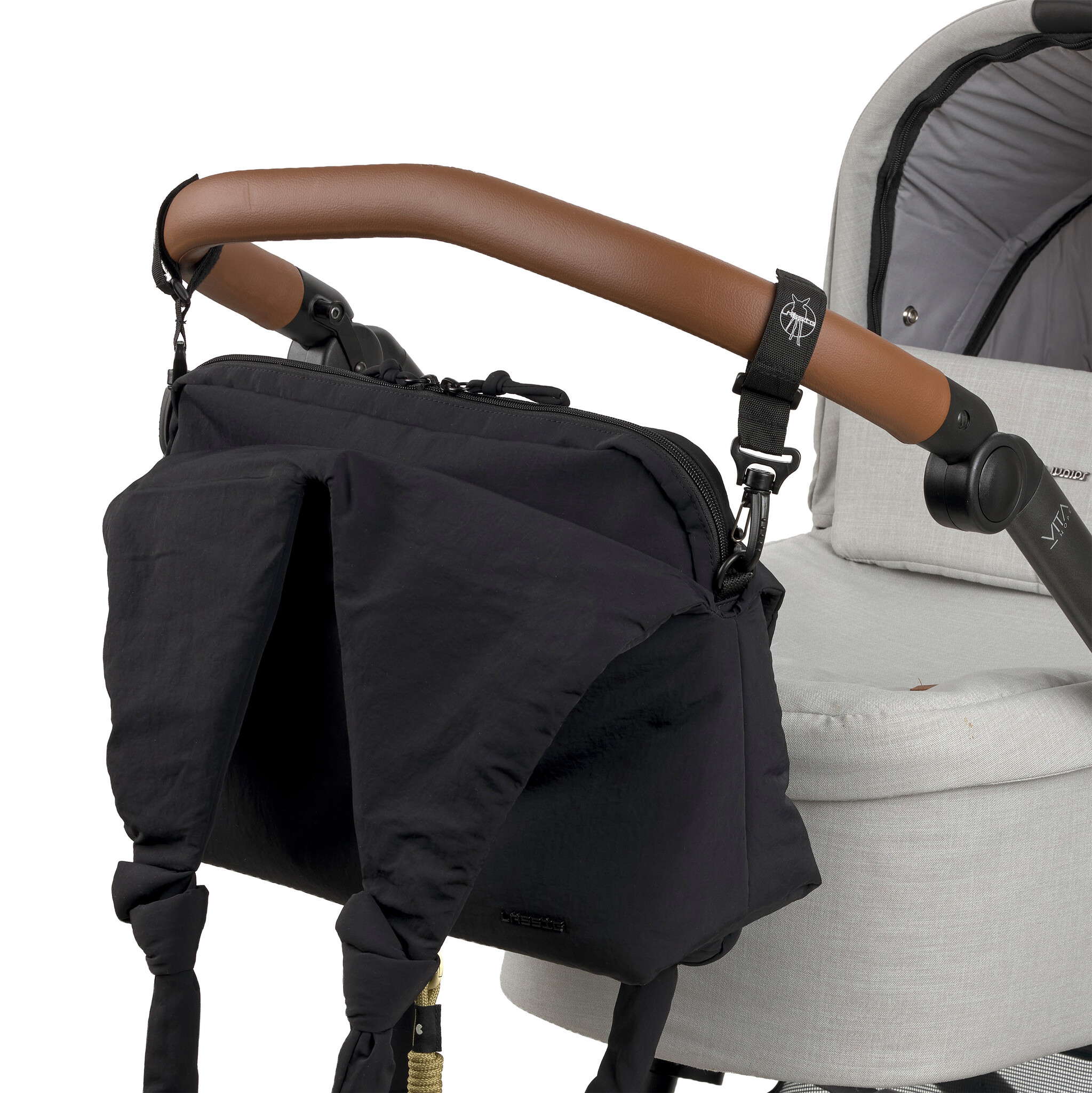 Hele stijlvolle en praktische luiertas Teya in de kleur black van de Green Label collectie van Lässig. De tas is gemaakt van zacht en gewatteerd recycled polyester met een licht kreukeleffect. In de tas zitten allemaal handige grote en kleine doordachte vakken zodat je heel veel spullen op een georganiseerde manier mee kunt nemen. De tas is stijlvol vormgegeven door de v-shape, leuke knopen en de gewatteerde schouderband. In het ruime hoofdvak kun je alles makkelijk terugvinden. Aan de buitenkant zitten 4 grote zijvakken. De tas is voorzien van een waterafstotend natvak. Verder is de tas voorzien van accessoires als haken om de tas mee aan de wagen te hangen, een verschoningsmatje en een klein etuitje.