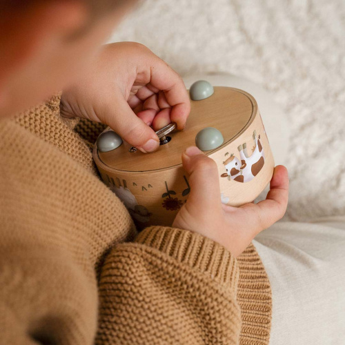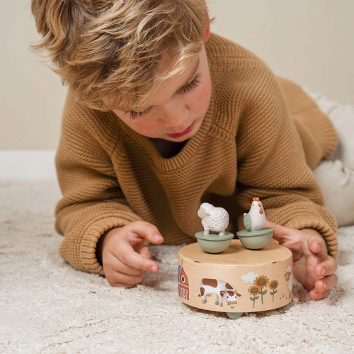 Heel mooi houten muziekdoosje in het thema Little Farm van het leuke Nederlandse merk Little Dutch. Het muziekdoosje is gemaakt van FSC gecertificeerd hout en voorzien van allemaal leuke afbeeldingen. Los op het doosje zitten een schaapje en een kipje die vrolijk ronddraaien wanneer het doosje muziek maakt. Aan de onderkant kun je het doosje opwinden zodat er een vrolijk liedje klinkt (old Mc Donald had a farm).