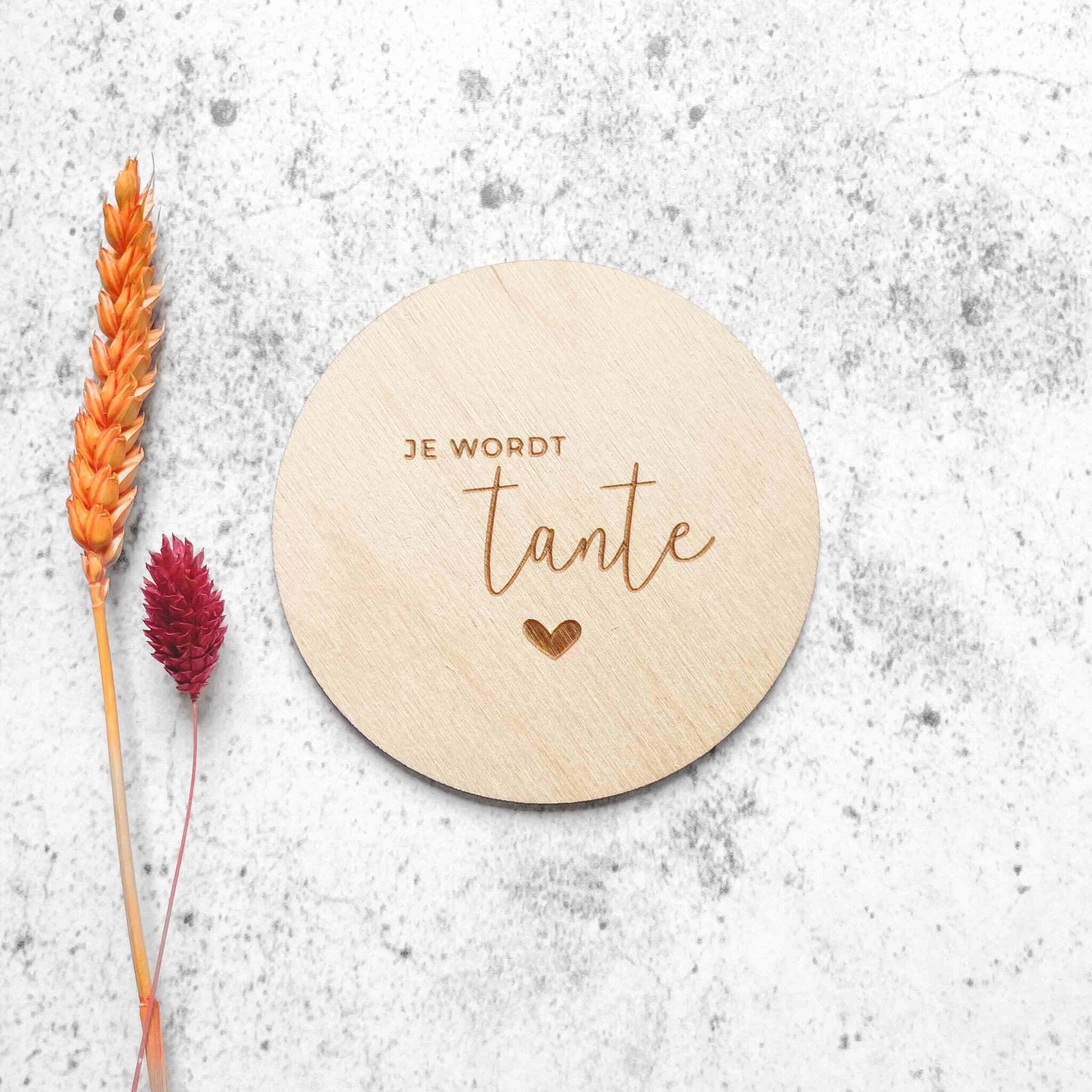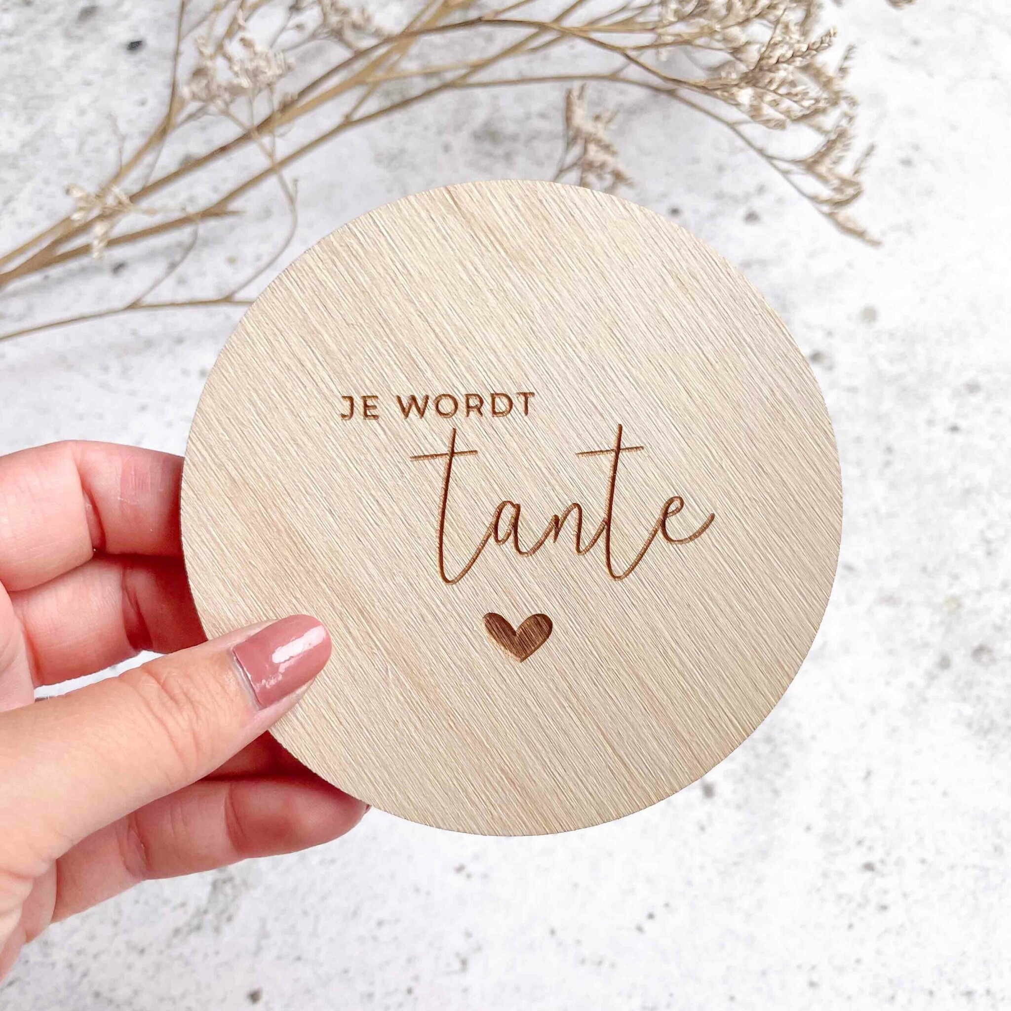 Gefeliciteerd, je bent zwanger! Dit wonder wil je natuurlijk op een unieke manier delen met al je geliefden. Met deze leuke houten cirkel "Je wordt tante" kun je iemand persoonlijk op de hoogte brengen van jouw zwangerschap. De cirkel is 10 cm groot en is gegraveerd. Je kunt de cirkel mooi inpakken of weggeven in het leuke bijpassende doosje.