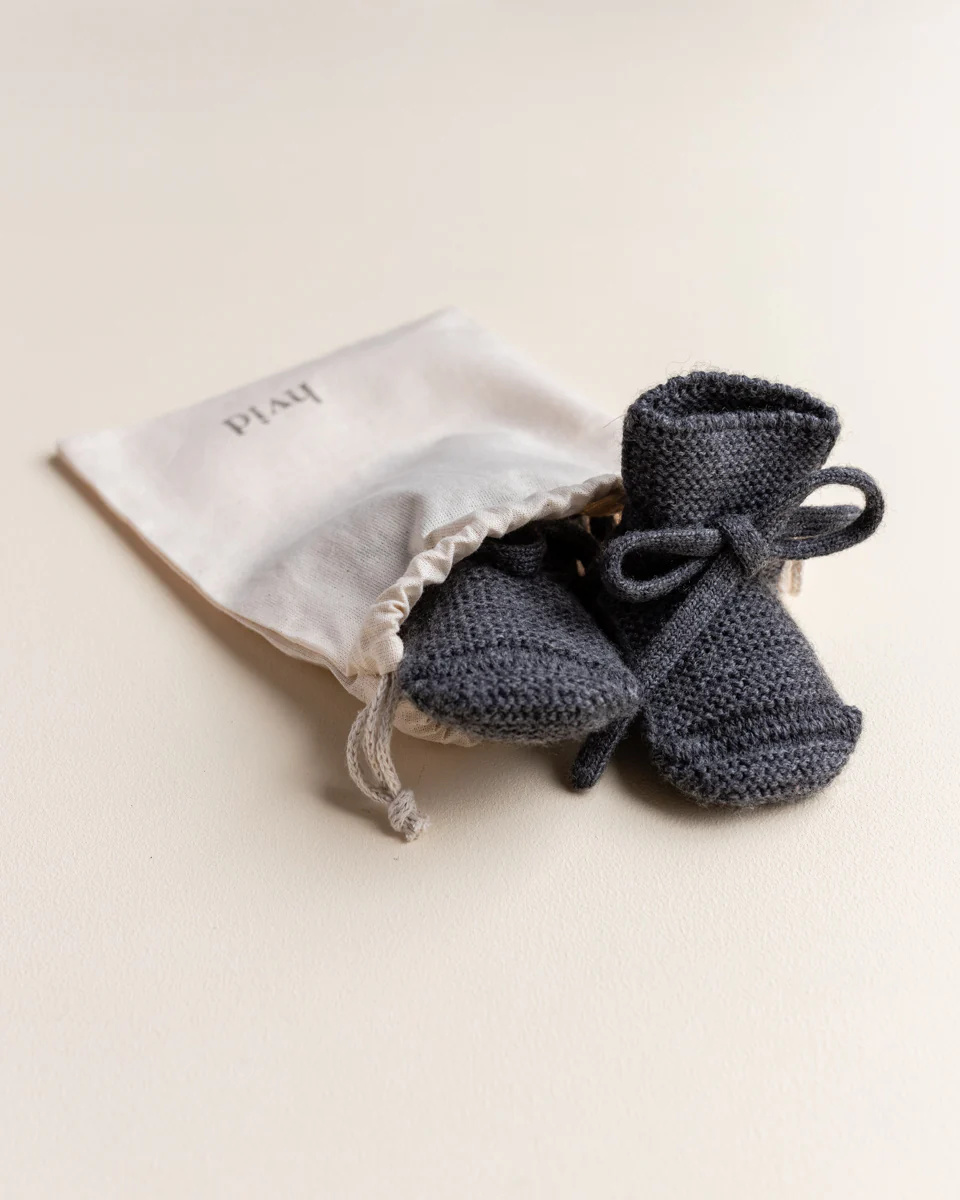 Deze booties in de kleur charcoal van het mooie Belgische merk Hvid houden de voetjes lekker warm. De booties zijn gemaakt van 100% extra fijne Italiaanse merino wol (Oeko-Tex en mulesing vrij). Hierdoor voelen ze extra zacht aan. De extra fijne merino wol kriebelt niet waardoor het geschikt is voor de meest gevoelige huid. Door het lintje blijven de slofjes heel goed zitten om de voetjes. Ook als het kindje veel beweegt met de beentjes. Merino wol kan in het begin pillen. Dit stopt na een tijdje vanzelf. De pluisjes zijn makkelijk te verwijderen met een machientje. Wol heeft een heleboel mooie eigenschappen. Zoals de zelfreinigende eigenschap waardoor je de slofjes bijna nooit hoeft te wassen. Vaak is het voldoende om ze even buiten te luchten. Mocht je ze toch willen wassen dan kun je dit het beste doen met de hand in lauwwarm water met een goed wolwasmiddel. Deze extra fijne merino wol jeukt niet waardoor de slofjes ook uitermate geschikt is voor kindjes met een hele gevoelige huid.
