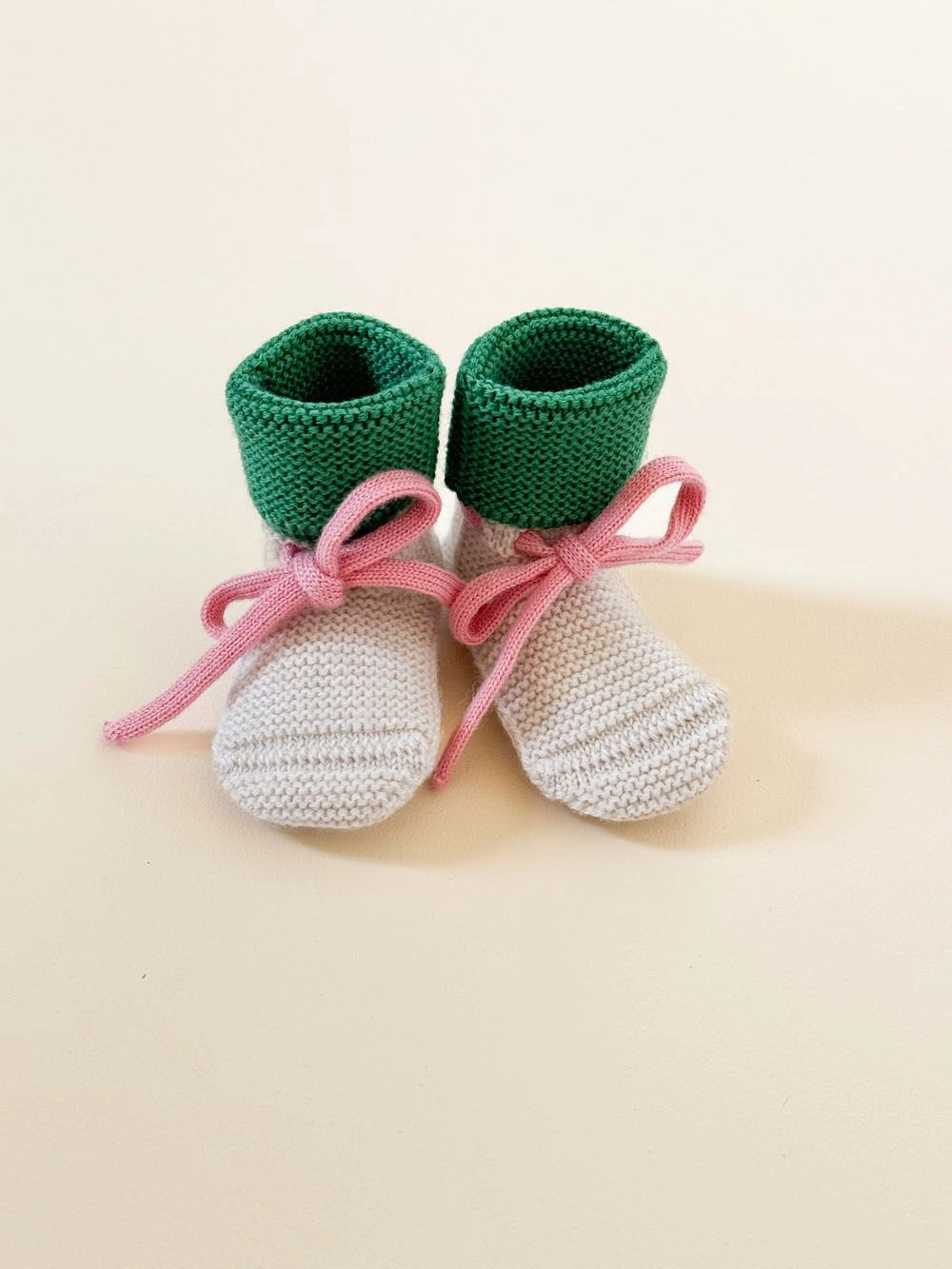 Deze booties in de kleur cream/ grass van het mooie Belgische merk Hvid houden de voetjes lekker warm. De booties zijn gemaakt van 100% extra fijne Italiaanse merino wol (Oeko-Tex en mulesing vrij). Hierdoor voelen ze extra zacht aan. De extra fijne merino wol kriebelt niet waardoor het geschikt is voor de meest gevoelige huid. Door het lintje blijven de slofjes heel goed zitten om de voetjes. Ook als het kindje veel beweegt met de beentjes. Merino wol kan in het begin pillen. Dit stopt na een tijdje vanzelf. De pluisjes zijn makkelijk te verwijderen met een machientje. Wol heeft een heleboel mooie eigenschappen. Zoals de zelfreinigende eigenschap waardoor je de slofjes bijna nooit hoeft te wassen. Vaak is het voldoende om ze even buiten te luchten. Mocht je ze toch willen wassen dan kun je dit het beste doen met de hand in lauwwarm water met een goed wolwasmiddel. Deze extra fijne merino wol jeukt niet waardoor de slofjes ook uitermate geschikt is voor kindjes met een hele gevoelige huid.