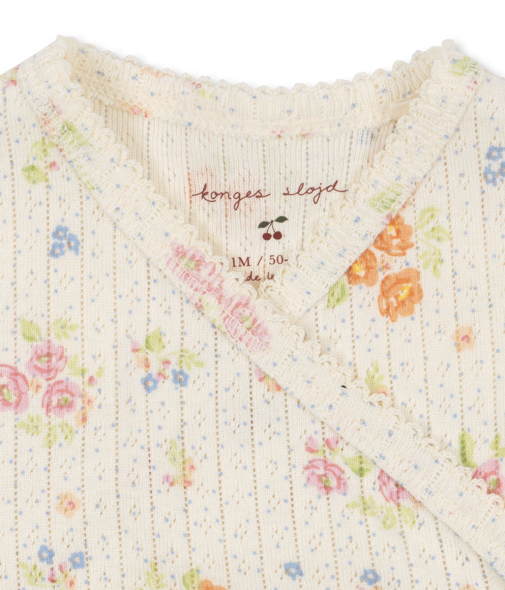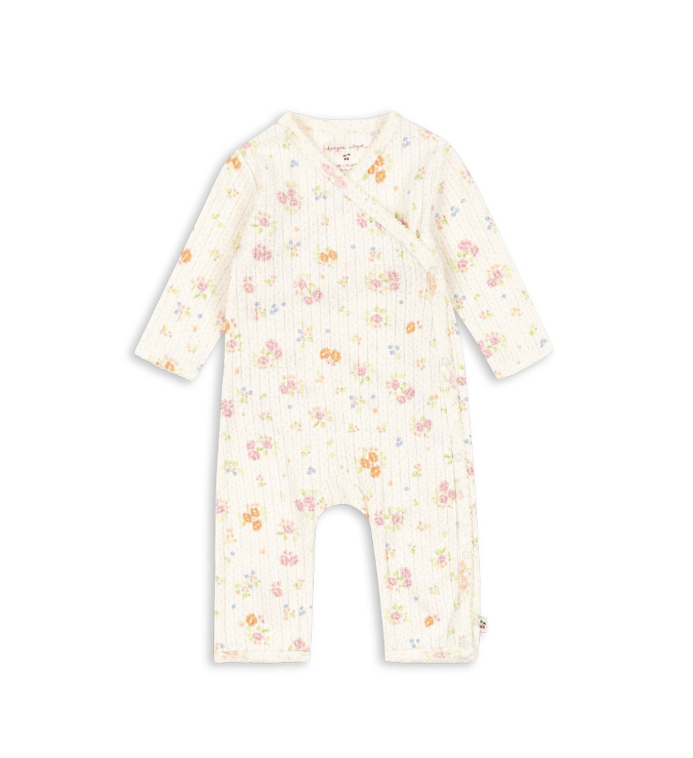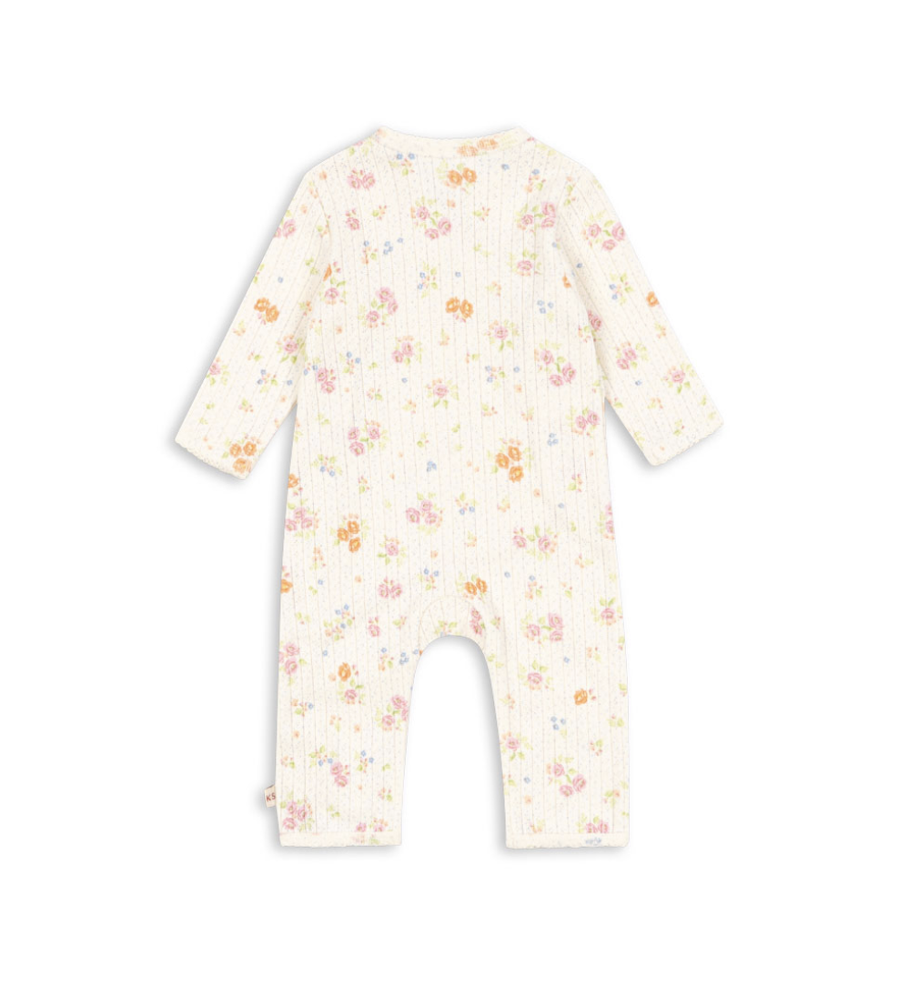 Heel mooi boxpakje met korte mouwen Minnie Nonoka van het leuke Deense merk Konges Sløjd. Het boxpakje is gemaakt van biologische katoen en voorzien van een mooi ajourpatroontje. Over het ajourpatroon is een patroontje van allemaal kleine bloemetjes gedrukt. Verder is het prachtig afgewerkt met een kantachtig randje langs de mouwen, halslijn en bij de beentjes. Het pakje heeft een overslag waardoor je hem makkelijk aan kunt krijgen. Door de beentjes drukkertjes tussen de beentjes kun jij jouw kindje makkelijk verschonen. Een heel leuk kraamcadeautje.