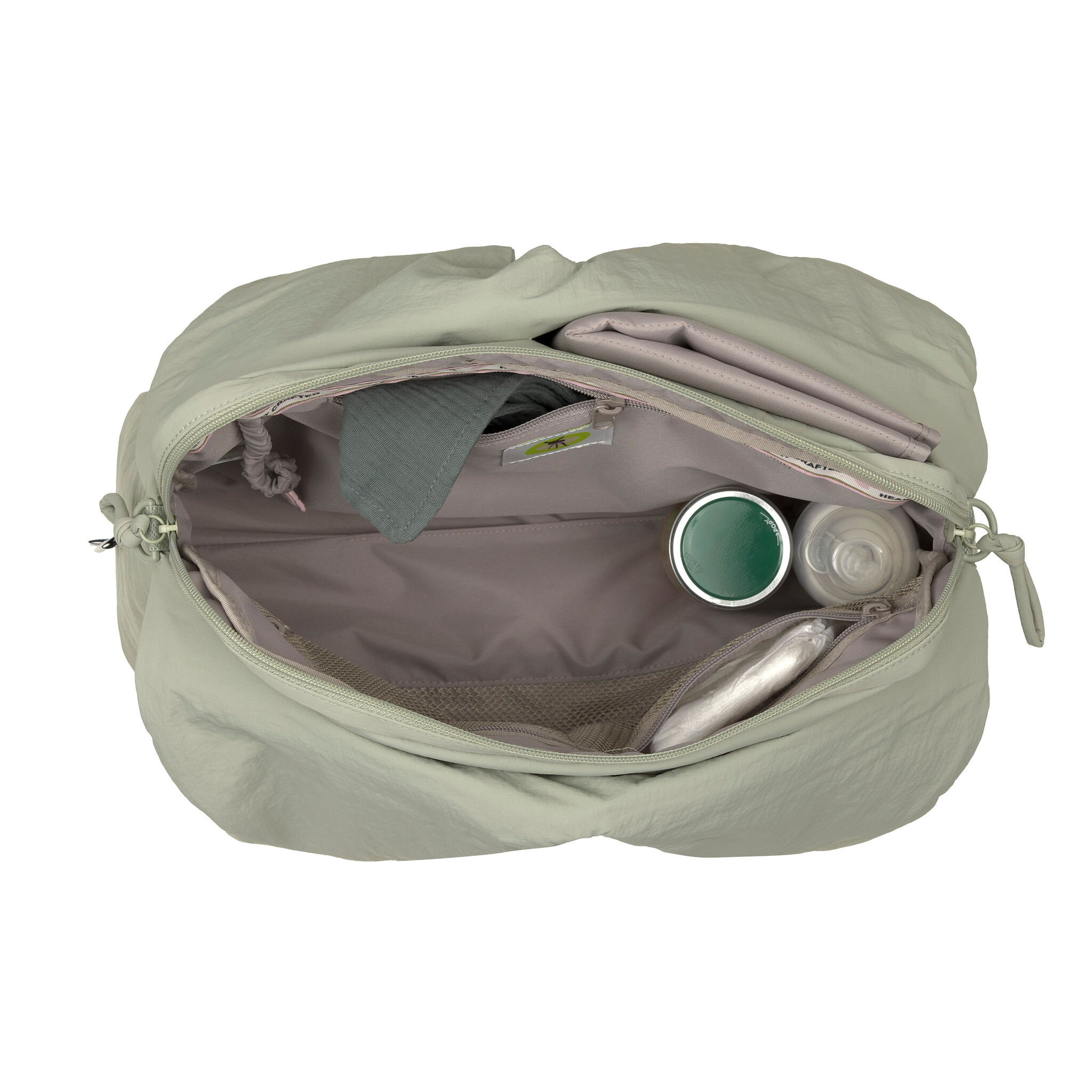 Hele stijlvolle en praktische luiertas Teya in de kleur mint van de Green Label collectie van Lässig. De tas is gemaakt van zacht en gewatteerd recycled polyester met een licht kreukeleffect. In de tas zitten allemaal handige grote en kleine doordachte vakken zodat je heel veel spullen op een georganiseerde manier mee kunt nemen. De tas is stijlvol vormgegeven door de v-shape, leuke knopen en de gewatteerde schouderband. In het ruime hoofdvak kun je alles makkelijk terugvinden. Aan de buitenkant zitten 4 grote zijvakken. De tas is voorzien van een waterafstotend natvak. Verder is de tas voorzien van accessoires als haken om de tas mee aan de wagen te hangen, een verschoningsmatje en een klein etuitje.