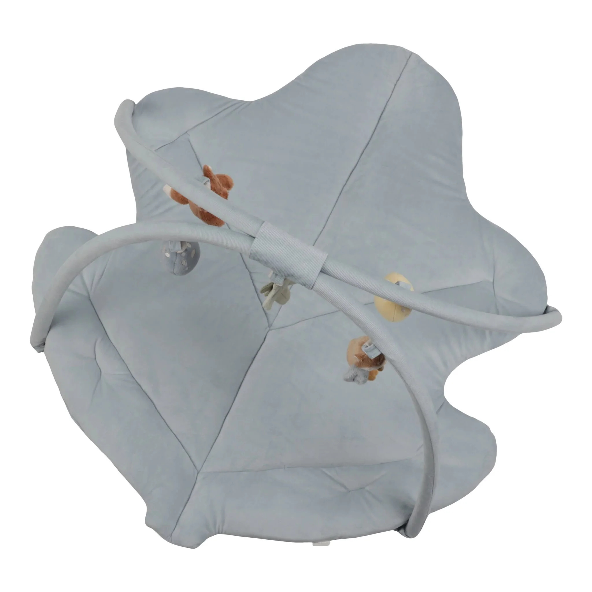 Heel leuk activiteiten speelkleed uit de serie Forest Friends van het Nederlandse merk Little Dutch. Met dit activiteiten speelkleed is zoveel te zien, te voelen en te horen. Het kleed heeft de vorm van een blad en is heerlijk dik en zacht. Het blauwe kleed heeft twee grote corduroy bogen waar vijf verschillende knuffeltjes uit de Forest Friends collectie aan hangen. Het lieve vosje, de wijze uil, gele en blauwe paddenstoel en het blaadje helpen je kindje bij het ontwikkelen van sensorische vaardigheden en stimuleren de hand-oogcoördinatie.