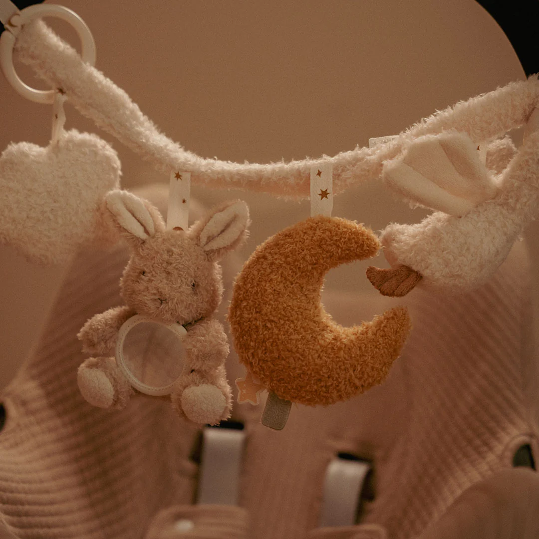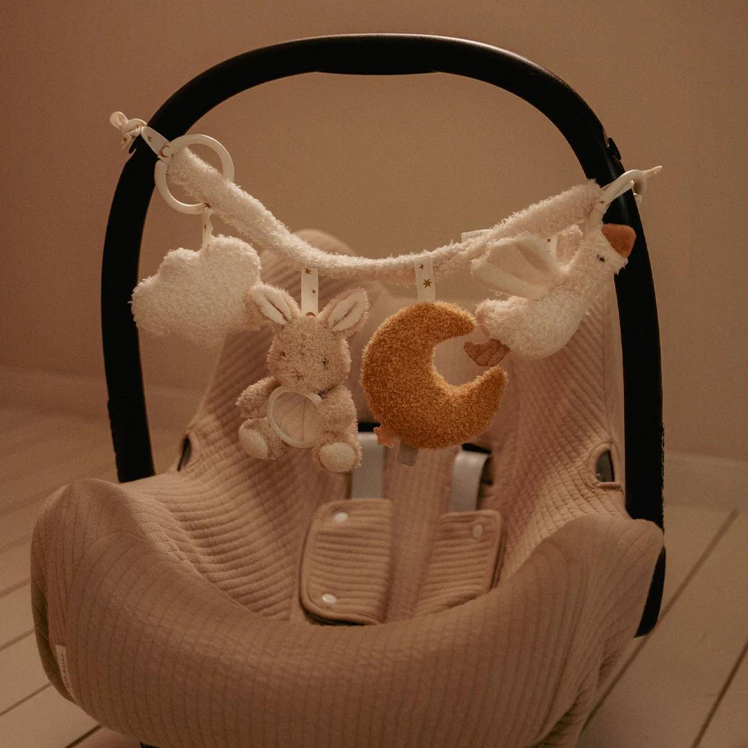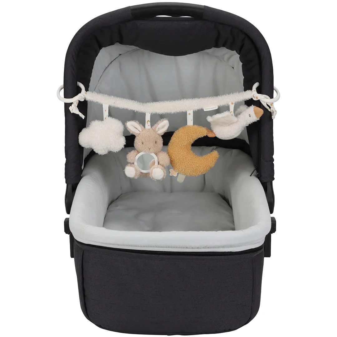 Prachtige wagenspanner uit de serie Little Farm van het leuke Nederlandse merk Little Dutch. De wagenspanner is gemaakt van zachte velours en voorzien van allemaal leuke speeltjes. Jouw kleintje kan uren kijken en spelen met de leuke speeltjes in de vorm van een boerderij, schaapje en zonnebloem en een kip. Geef je kindje een zintuiglijke ervaring met deze kleurrijke wagenspanner, die de ontwikkeling van de hand-oogcoördinatie stimuleert terwijl jullie onderweg zijn. Je bevestigd de wagenspanner heel makkelijk aan je wagen met de bijgevoegde ringen.