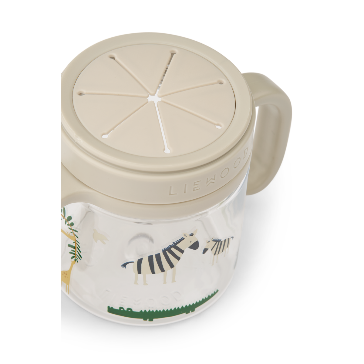 Hele handige snack cup Enyo met de print all together / sandy van het leuke merk Liewood. De snack cup is gemaakt van tritan en harde kunststof vrij van schadelijke materialen. Tritan is een duurzame vervanger van glas. Op het transparante bakje zijn allemaal vrolijke dieren geprint. Deze handige snackbeker heeft handvaten waardoor jouw kleintje hem makkelijk kunt vastpakken. Aan de bovenkant zitten flapjes die de snackjes tegenhouden mocht je kindje de beker ondersteboven houden. Met de deksel sluit je alles makkelijk af en blijft alles lekker vers. Heel handig voor onderweg.