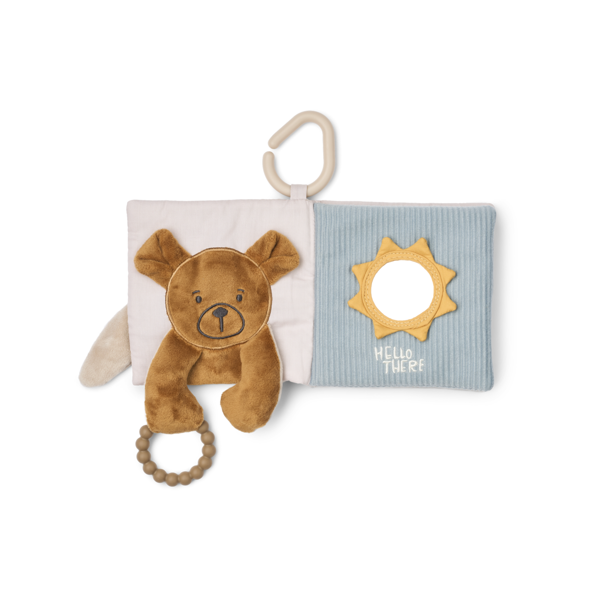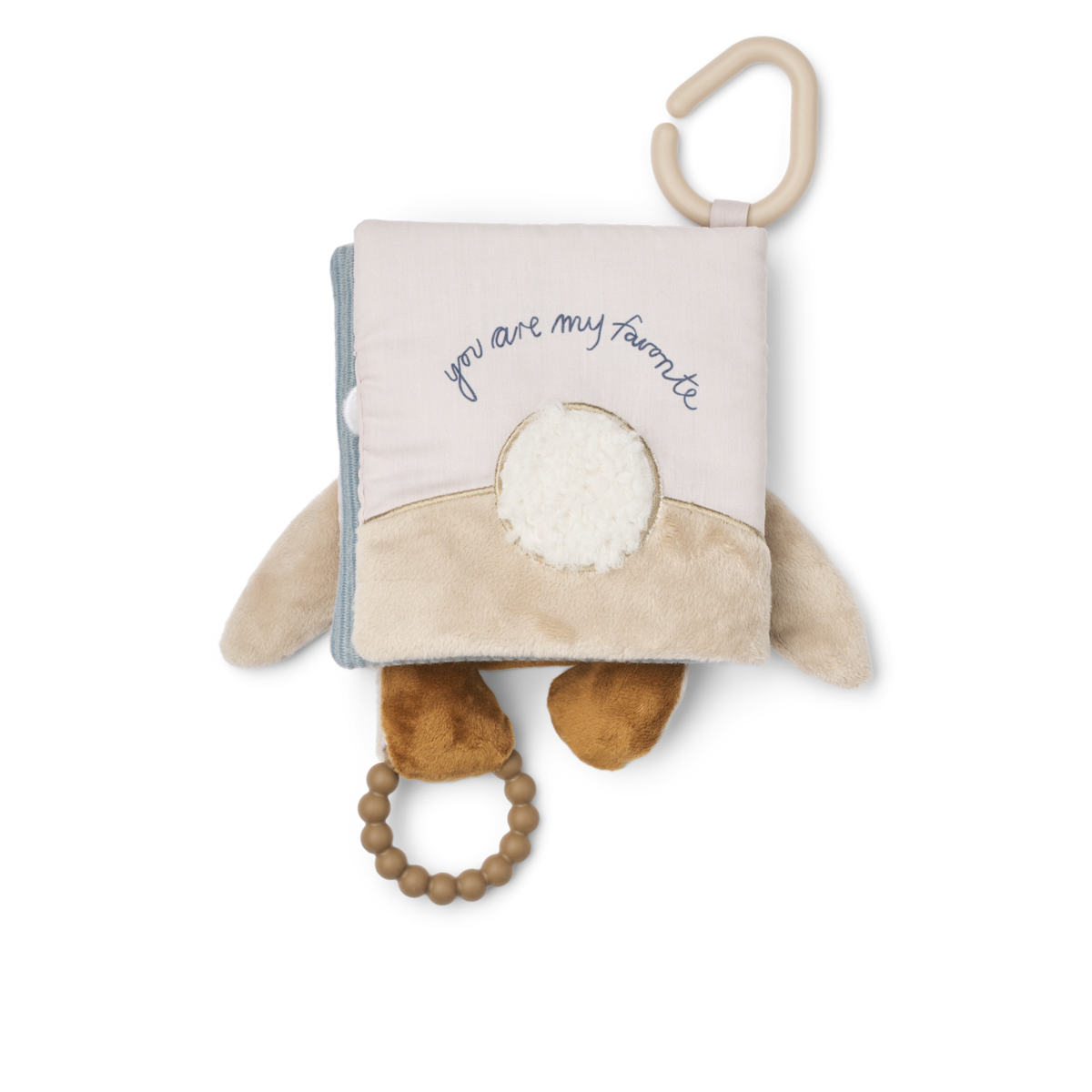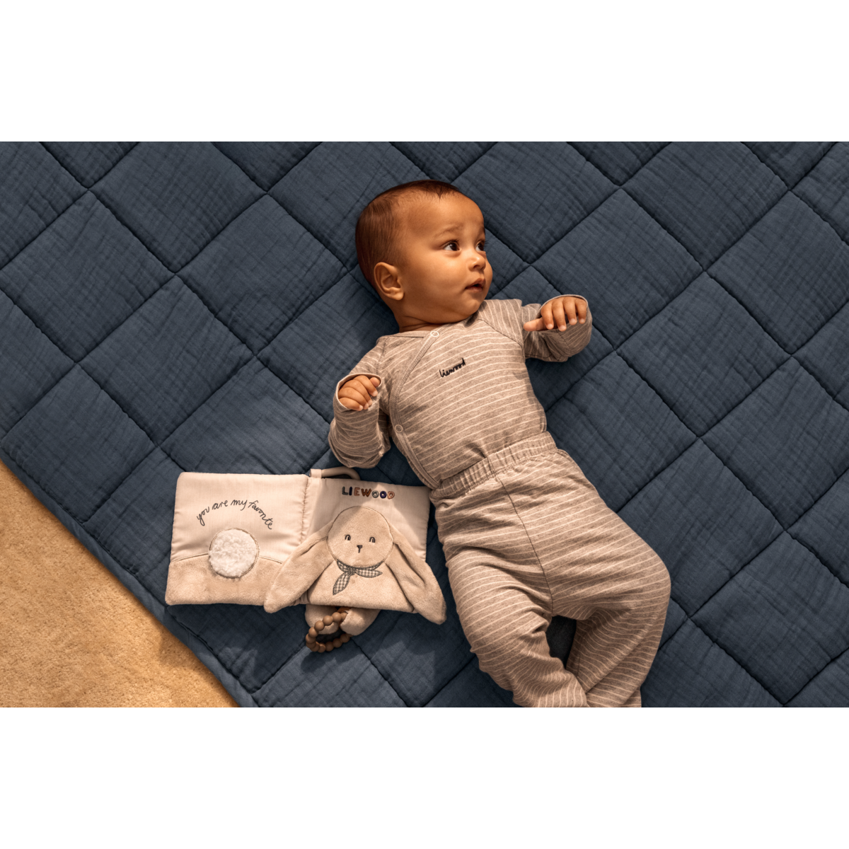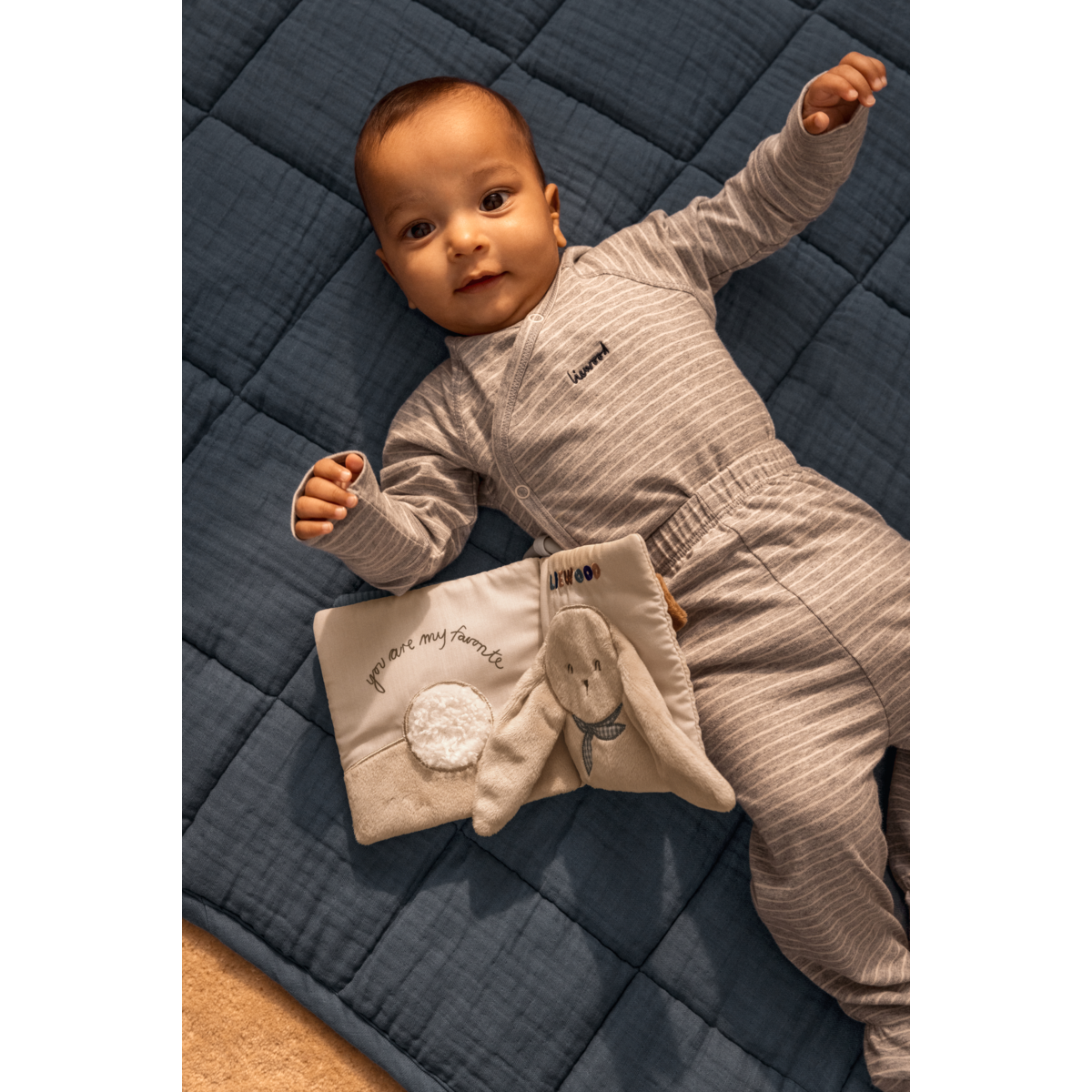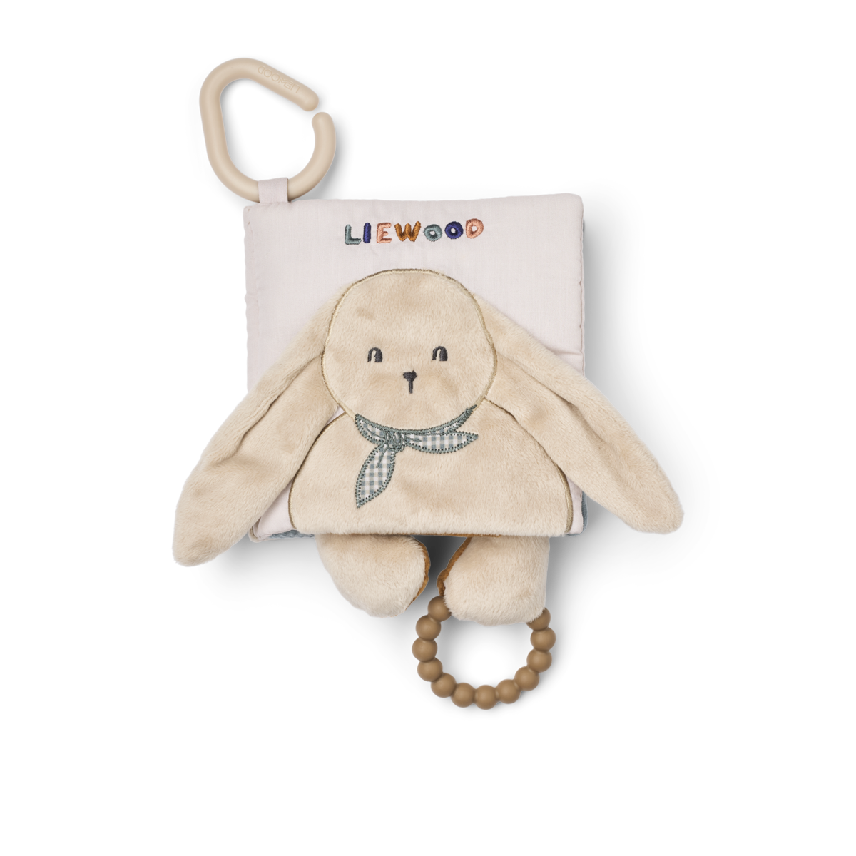 Prachtig stoffen boekje Fey in de kleur Sandy multi mix van Liewood. Het boekje is gemaakt van 100% recycled polyester. De bijtring is gemaakt van BPA vrij siliconen. Het boekje bestaat uit verschillende pagina's voorzien van allemaal leuke zachte afbeeldingen. Op de voorkant staat een schattig zacht konijntje met lange oren die fijn knisperen. In het pootje zit een siliconen bijtring. In het boekje zit ook een spiegeltje. Door de verschillende materialen en afbeeldingen kan er lekker lang mee gespeeld worden. Een heel leuk cadeau voor een kindje dat lekker wil spelen.
