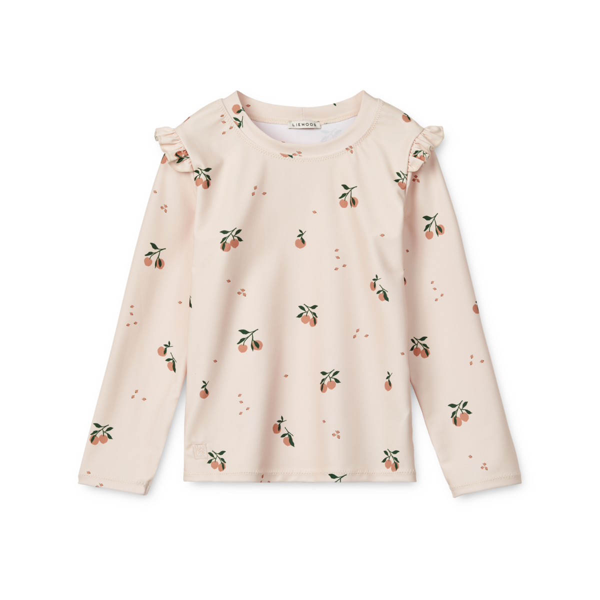 Een mooi en functioneel UV T-shirt Tenley in de kleur peach van Liewood. Het shirtje is gemaakt van een mix van recycled polyester met elastan waardoor je het makkelijk aan krijgt bij jouw kleintje. Het materiaal is snel droog wat wel zo comfortabel is. Het shirtje heeft lange mouwen, een print van allemaal lieve kleine kersjes en leuke ruches langs de armsgaten.