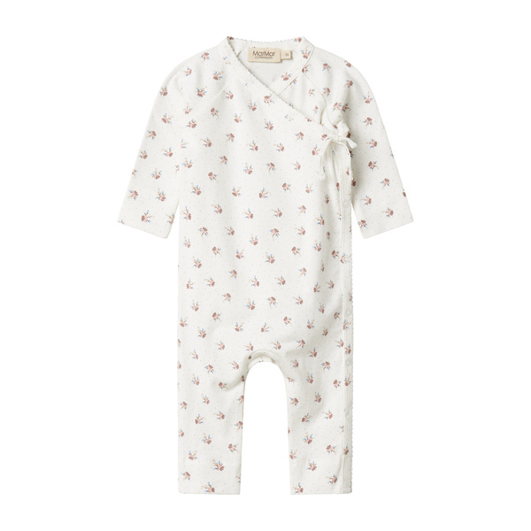 Heerlijk zacht newborn pakje Rula in de kleur Little Sakura van het duurzame merk MarMar Copenhagen. Dit mooie pakje is gemaakt van een mix van Modal met elastan waardoor het heerlijk zacht aanvoelt. Door de handige wikkelsliuiting hoef je het pakje niet over het hoofdje van jouw pasgeboren baby aan te doen. Het pakje is voorzien van een mooie allover print van allemaal kleine bloemetjes. Combineer het met het bijpassende mutsje.
