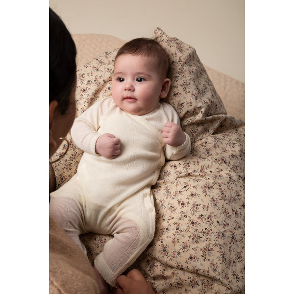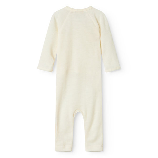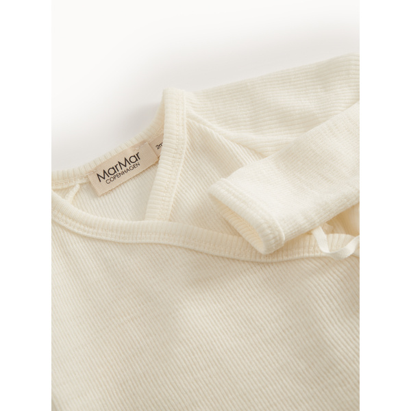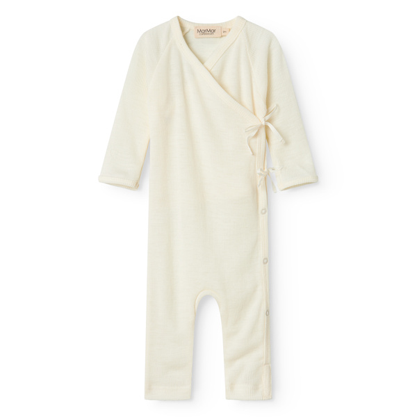 Heerlijk zacht wollen newborn pakje Rula in de kleur natural van het duurzame merk MarMar Copenhagen. Dit mooie pakje is gemaakt van merino wol waardoor het heerlijk zacht aanvoelt en niet kriebelt. Door de handige wikkelsliuiting hoef je het pakje niet over het hoofdje van jouw pasgeboren baby aan te doen. Het pakje heeft een fijn ingebreid rib patroontje. Combineer het met het bijpassende mutsje.