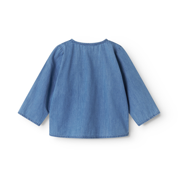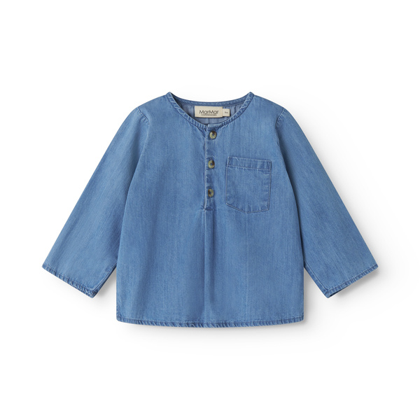 Heel mooi denim shirt Troy van het Deense merk MarMar Copenhagen. Het shirt is gemaakt van van biologische katoen. Het shirt heeft een denim wassing en mooie stiksels. De soepele stof draagt heel fijn en zacht. Aan de voorkant zit een knoopsluiting tot halverwege met mooie knoopjes. Het shirtje heeft verder een leuk borstzakje en een mooi labeltje. Leuk te combineren op een shortje of zomers broekje.
