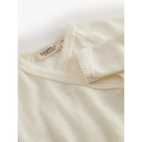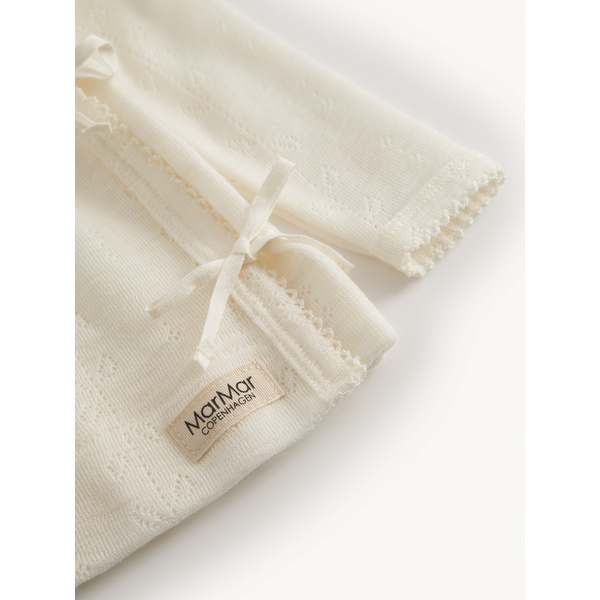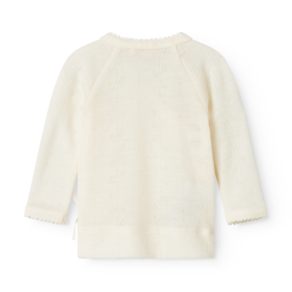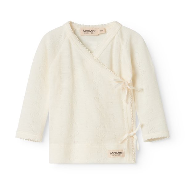 Heerlijk zacht wollen newborn wikkeltruitje Tut pointelle in de kleur natural van het duurzame merk MarMar Copenhagen. Dit mooie truitje is gemaakt van merino wol waardoor het heerlijk zacht aanvoelt en niet kriebelt. Door de handige wikkelsluiting hoef je het truitje niet over het hoofdje van jouw pasgeboren baby te doen. Het topje heeft een mooi fijn ingebreid patroontje waardoor het extra bijzonder wordt. Het vestje is mooi te combineren met het bijpassende broekje en mutsje tot een mooie newborn set.
