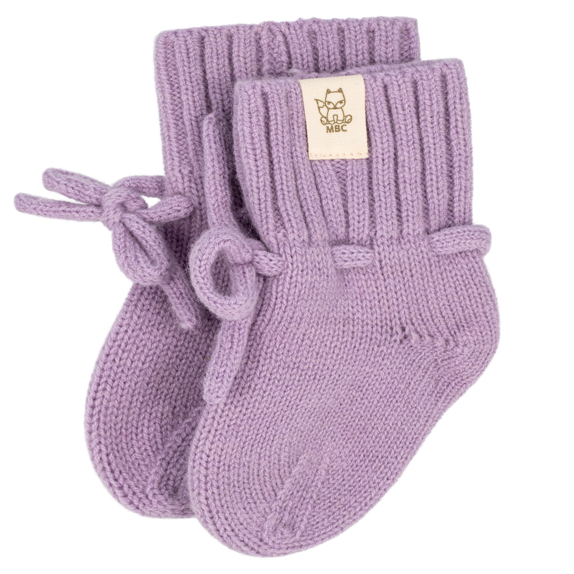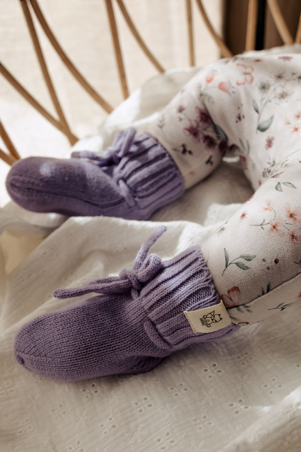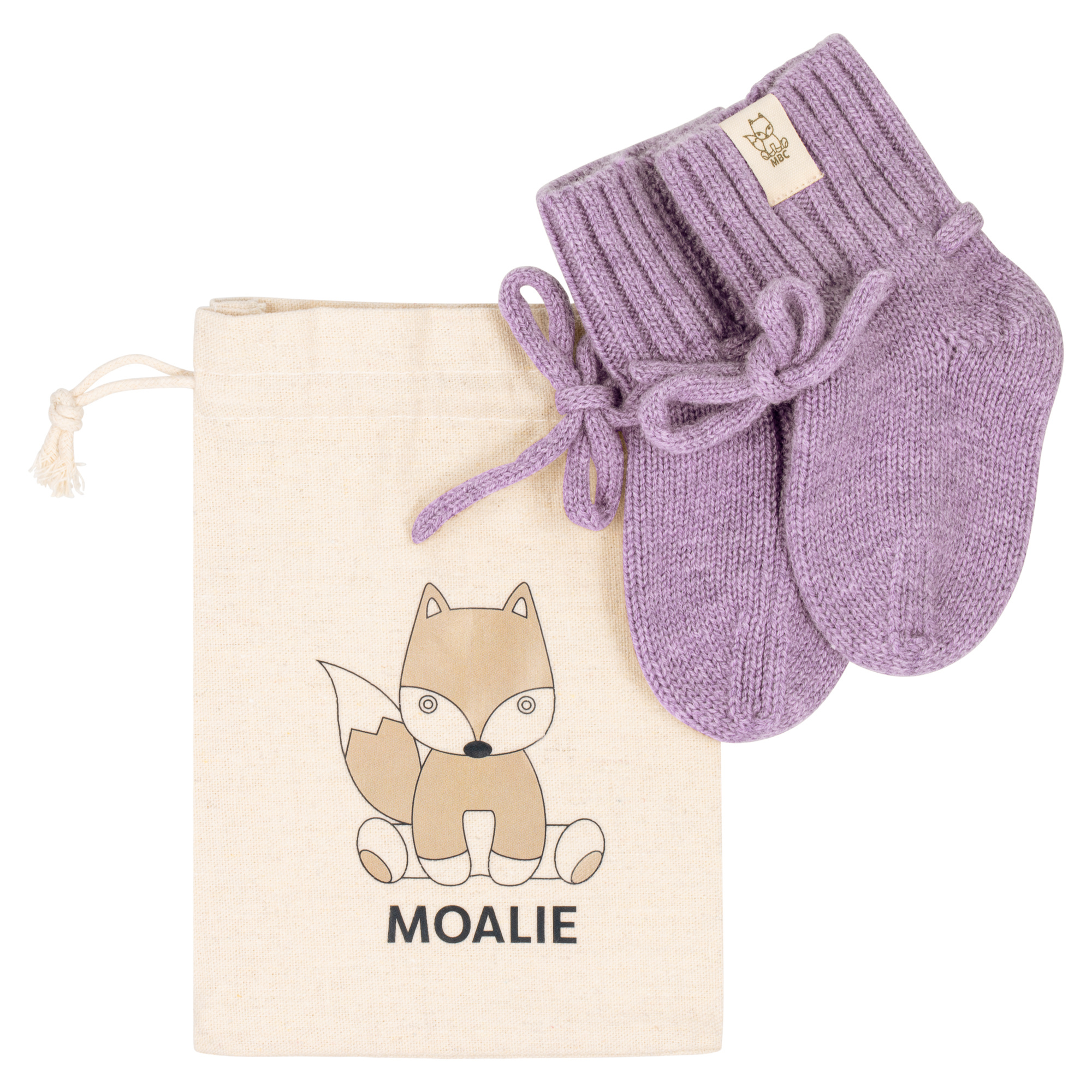 Heerlijke zachte wollen baby booties in de kleur Lavender van het mooie Nederlandse merk Moalie. De slofjes zijn gemaakt van zachte merinowol waardoor ze heel warm zitten. Wol reguleert op een natuurlijke manier de temperatuur van jouw kindje. Dit is heel belangrijk omdat veel kleintjes hun warmte niet vanzelf vast kunnen houden. Wollen voetjes is echt belangrijk.