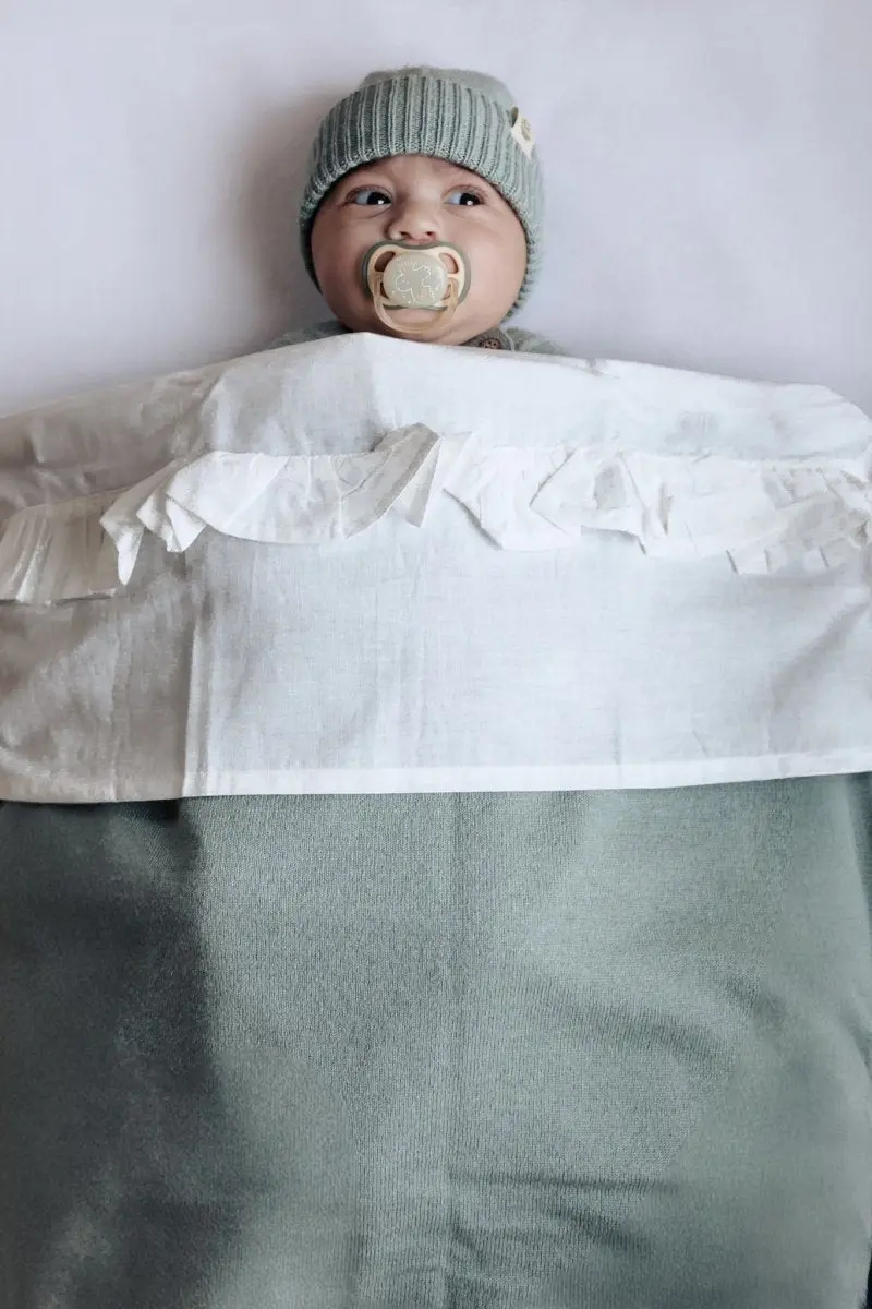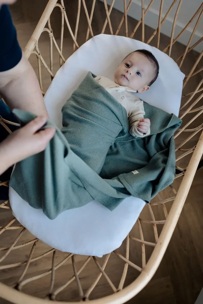 Een prachtige merino wollen deken in de kleur Sage van het Nederlandse wolmerk Moalie. De deken is gemaakt van een mix van mulesingvrije fijne merino wol met cashmere. Het voordeel van deze combinatie is dat het de temperatuur reguleert en het voelt luchtig en zacht aan voor de gevoelige babyhuid. Hierdoor is merinowol geschikt voor alle seizoenen. Het bijzondere aan deze deken is dat hij ook een kapje heeft zodat je hem ook als wikkeldoek kunt gebruiken. Deze deken is ontwikkeld door een NICU-verpleegkundige met heel veel ervaring.