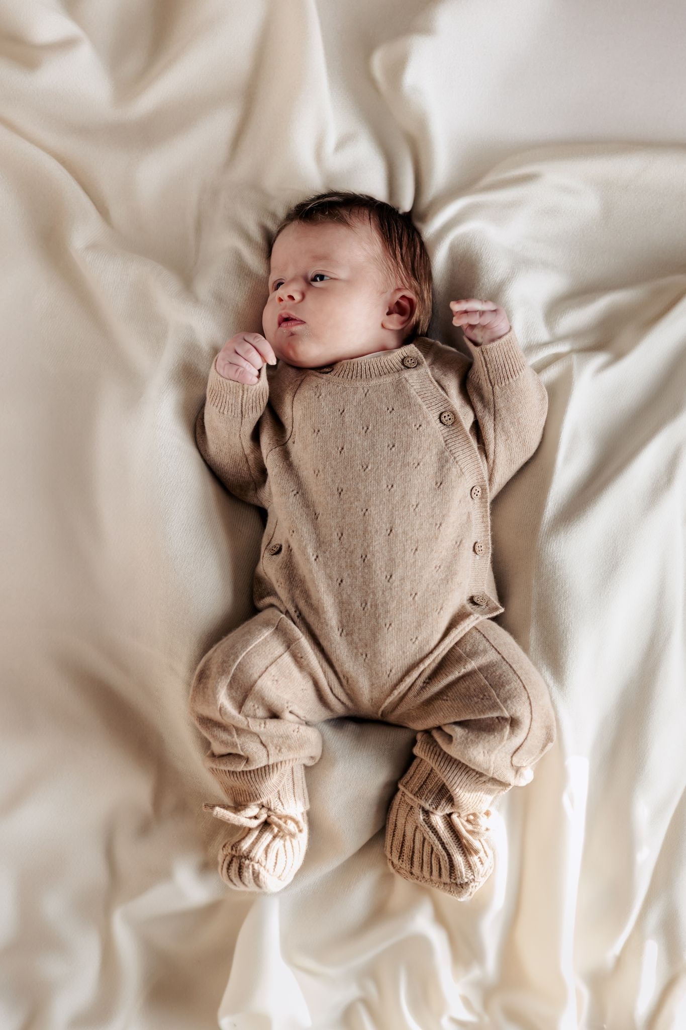 Prachtig wollen pointelle jumpsuit in de kleur Sienna van het mooie Nederlandse merk Moalie. De jumpsuit is gemaakt van merinowol met een beetje cashemere waardoor hij heel zacht aanvoelt. Wol houdt de warmte van jouw kindje op een natuurlijke manier op temperatuur. Ideaal voor kleine baby's. Het pakje heeft een mooi ingebreid patroontje en sluit aan de voorkant met mooie houten knoopjes. Door de wikkelsluiting krijg je het pakje makkelijk aan bij jouw kleintje.