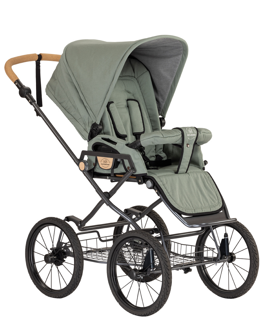 Deze prachtige kinderwagen met reismand Ida in Jade van Naturkind is helemaal op een duurzame manier vervaardigd. Naturkind is een Oostenrijks familiebedrijf dat al jaren in een eigen atelier met de hand kinderwagens maakt op een volledig duurzame manier. Alle materialen die ze gebruiken zijn GOTS-gecertificeerd. De wagen is prachtig vormgegeven en voorzien van allerlei mooie en praktische details.