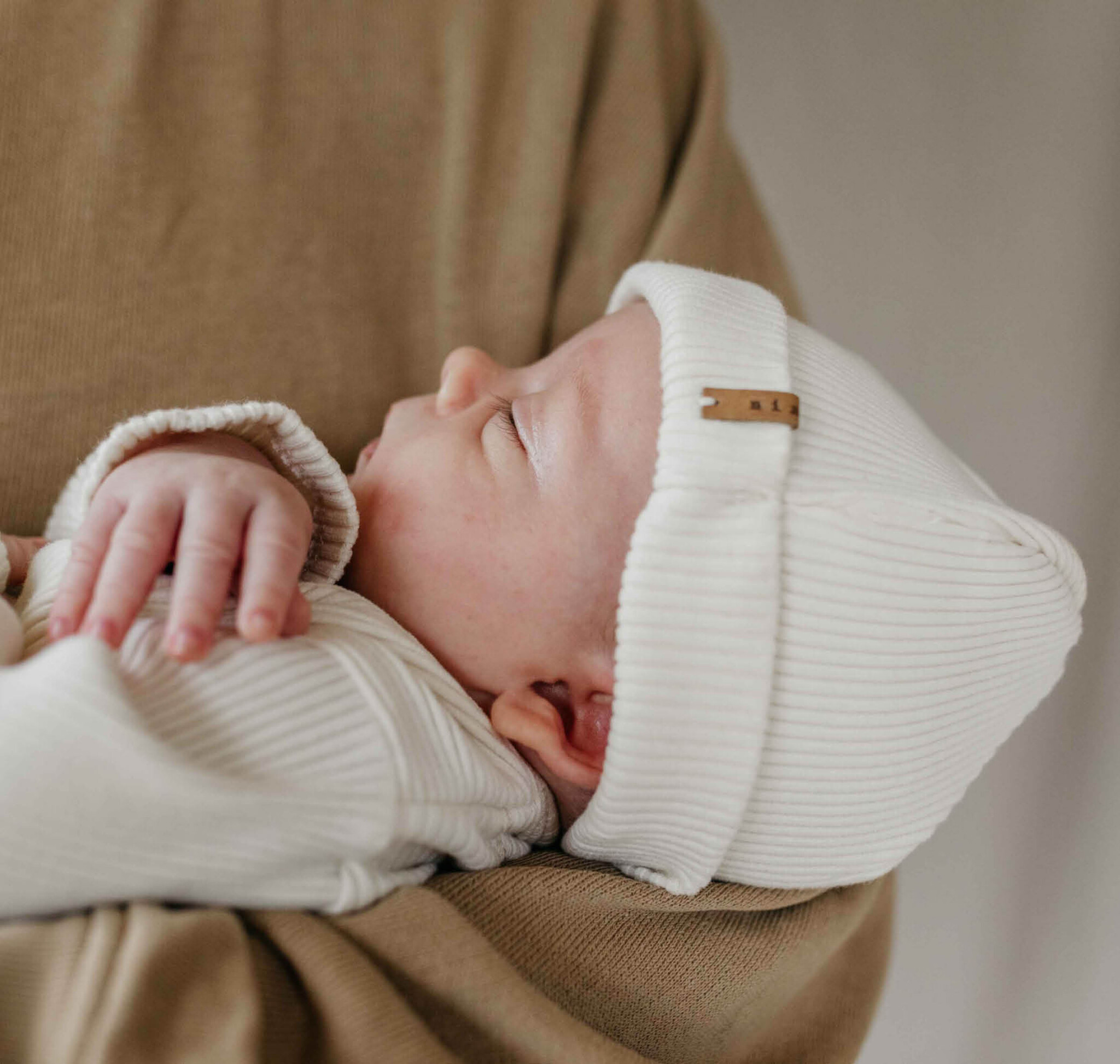 Heerlijk zacht newborn mutsje Rib Beanie in de kleur beige van het mooie Nederlandse merk Nixnut. Het mutsje is gemaakt van biologische katoen met een beetje elastane. Door de fijne ribstructuur zit hij extra comfortabel. Het mutsje is mooi afgewerkt met een mooi labeltje.