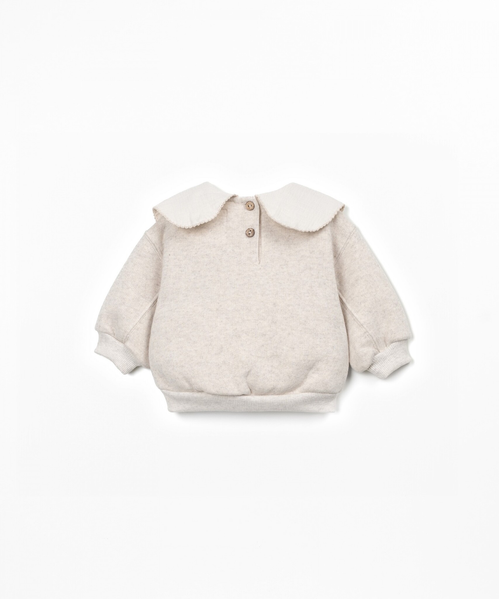 Prachtige sweater met kraag in de kleur Tones van het mooie Portugese merk Play Up. De sweater is gemaakt van zachte biologische fleece katoen waardoor hij heerlijk zacht zit. De sweater is gemaakt van een mix van katoen met recyclede katoen. Heet model heeft zachte rib boorden en sluit aan de achterkant met mooie knoopjes gemaakt van kokosnoot. De sweater is een echte eye-catcher door de prachtige kraag. Combineer hem op een van de leuke broekjes van dit mooie merk.