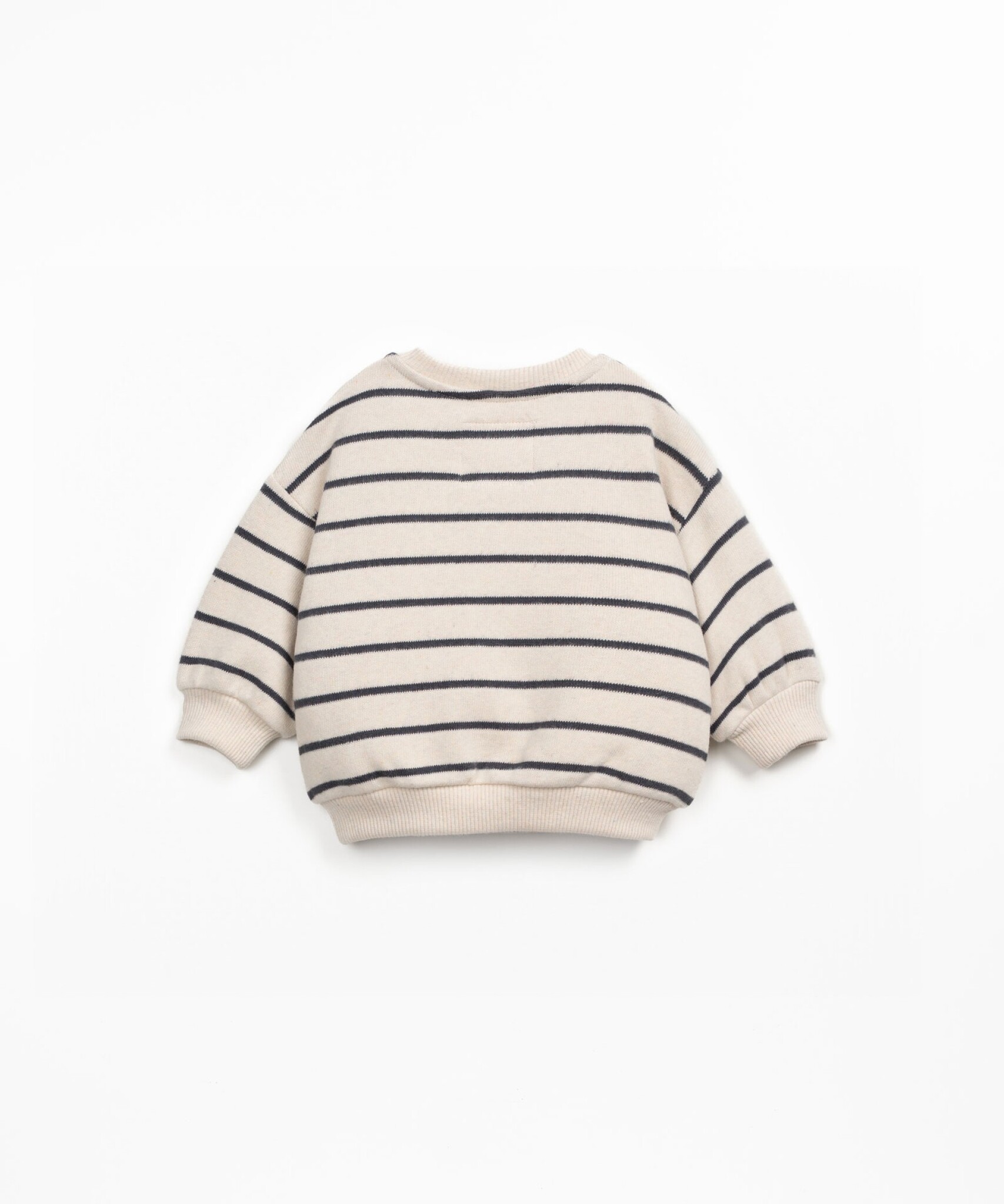 Heerlijk zachte sweater stripe van het mooie duurzame merk Play Up. De sweater is gemaakt van biologische katoen en recyclede katoen. De sweater is licht gebrushed hierdoor voelt hij heel zacht aan. Op de schouder zitten houten knoopjes zodat je hem makkelijk over het hoofd van jouw kleintje kunt krijgen.
