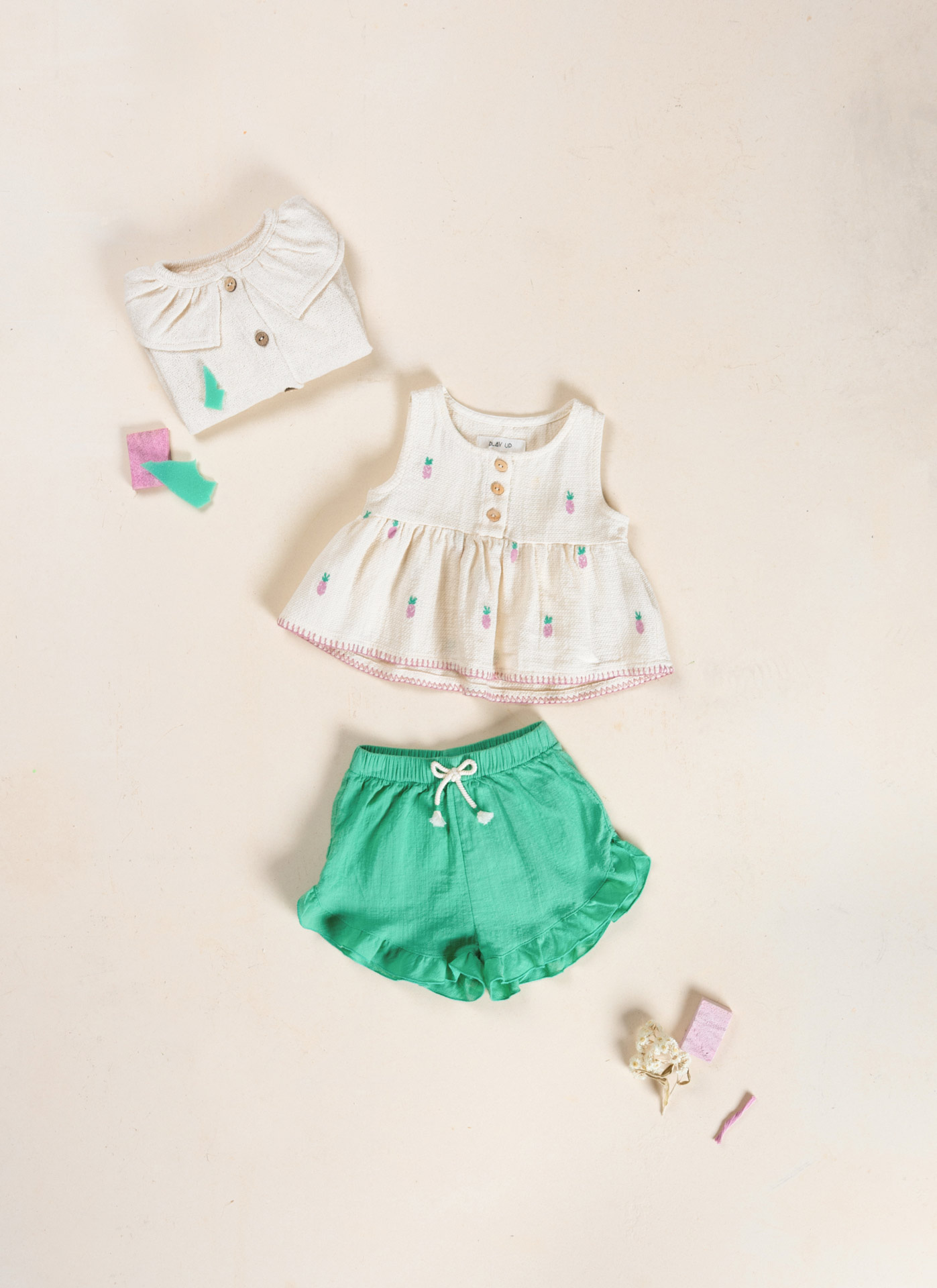 Prachtige zomerse top in de kleur Bio Resin van het duurzame merk Play Up. De top is gemaakt van biologische katoen die is voorzien van een mooie zomerse structuur. Op de ondergrond zijn allemaal kleine ananasjes geborduurd. De top heeft een wat aangesloten lijfje en een leuke brede wijde ruche aan de onderkant. Aan de voorkant zitten mooie houten knoopjes. Leuk te combineren op het groene shortje van dit mooie merk.