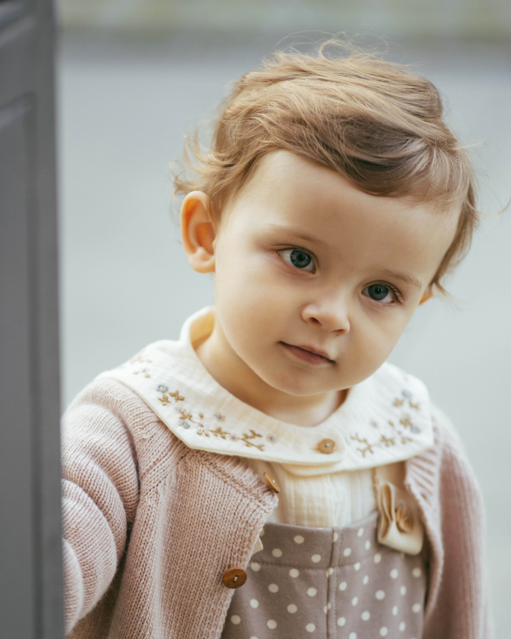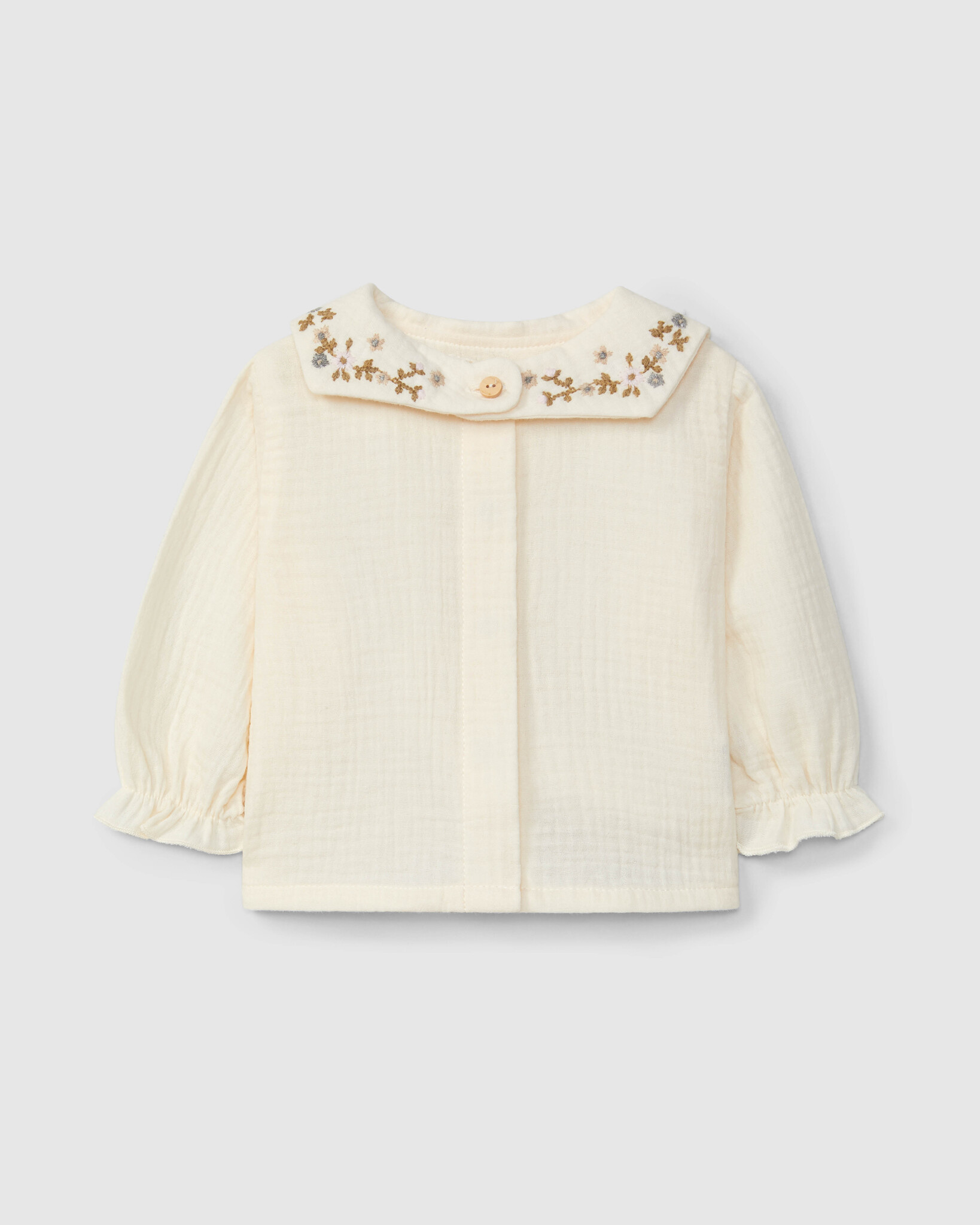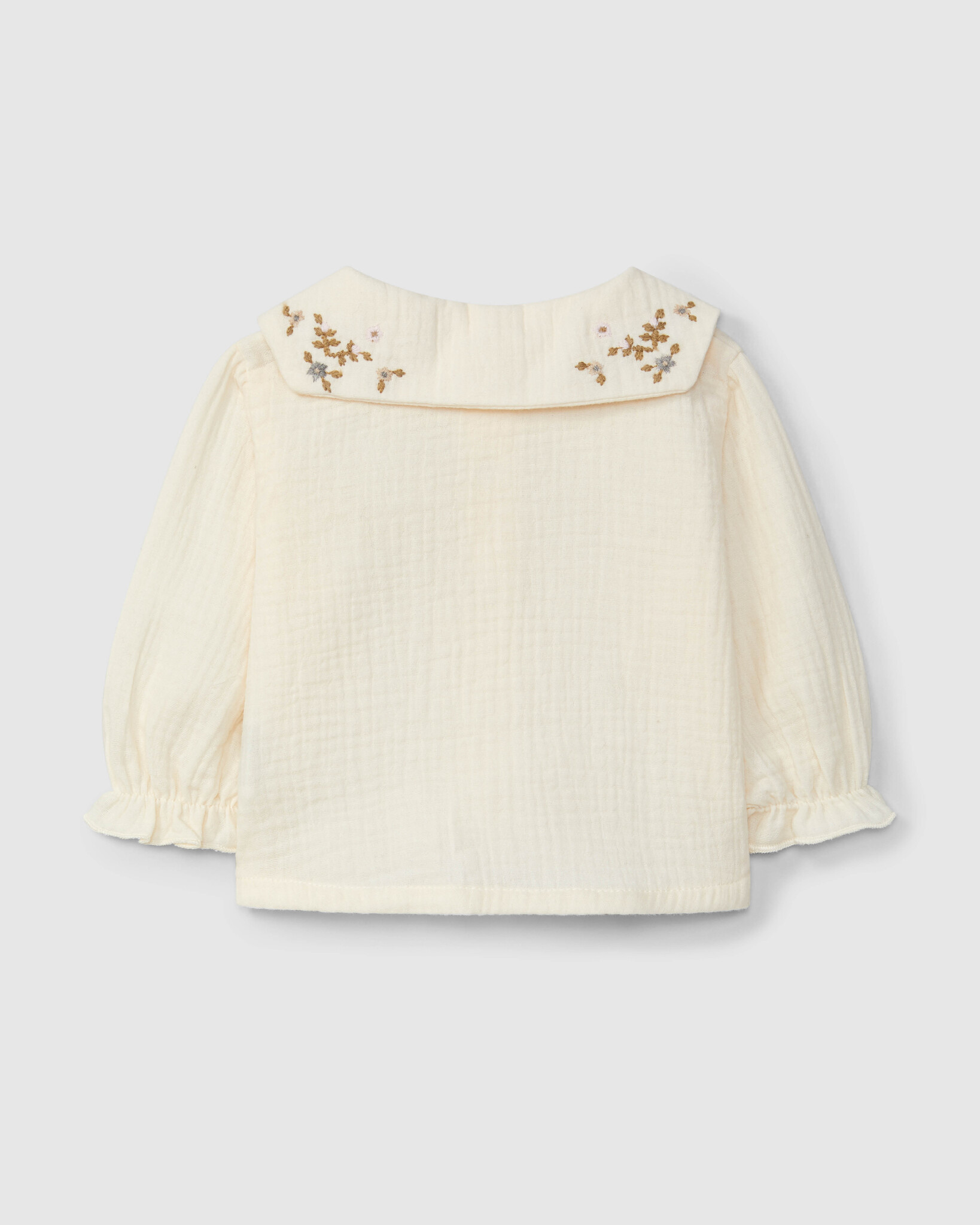 Super schattig bloesje colar flower naturel van het mooie Portugese merk Snug. Het bloesje is gemaakt van zachte biologische katoen. Het kraagje is voorzien van een prachtig borduur van allemaal kleine bloemetjes. Het bloesje sluit met houten knoopjes waarvan alleen de bovenste zichtbaar is. Door de blinde sluiting komt het kraagje nog mooier uit. Bij de polsen zit zacht elastiek waardoor je het bloesje makkelijk aankrijgt. Een echte must-have.