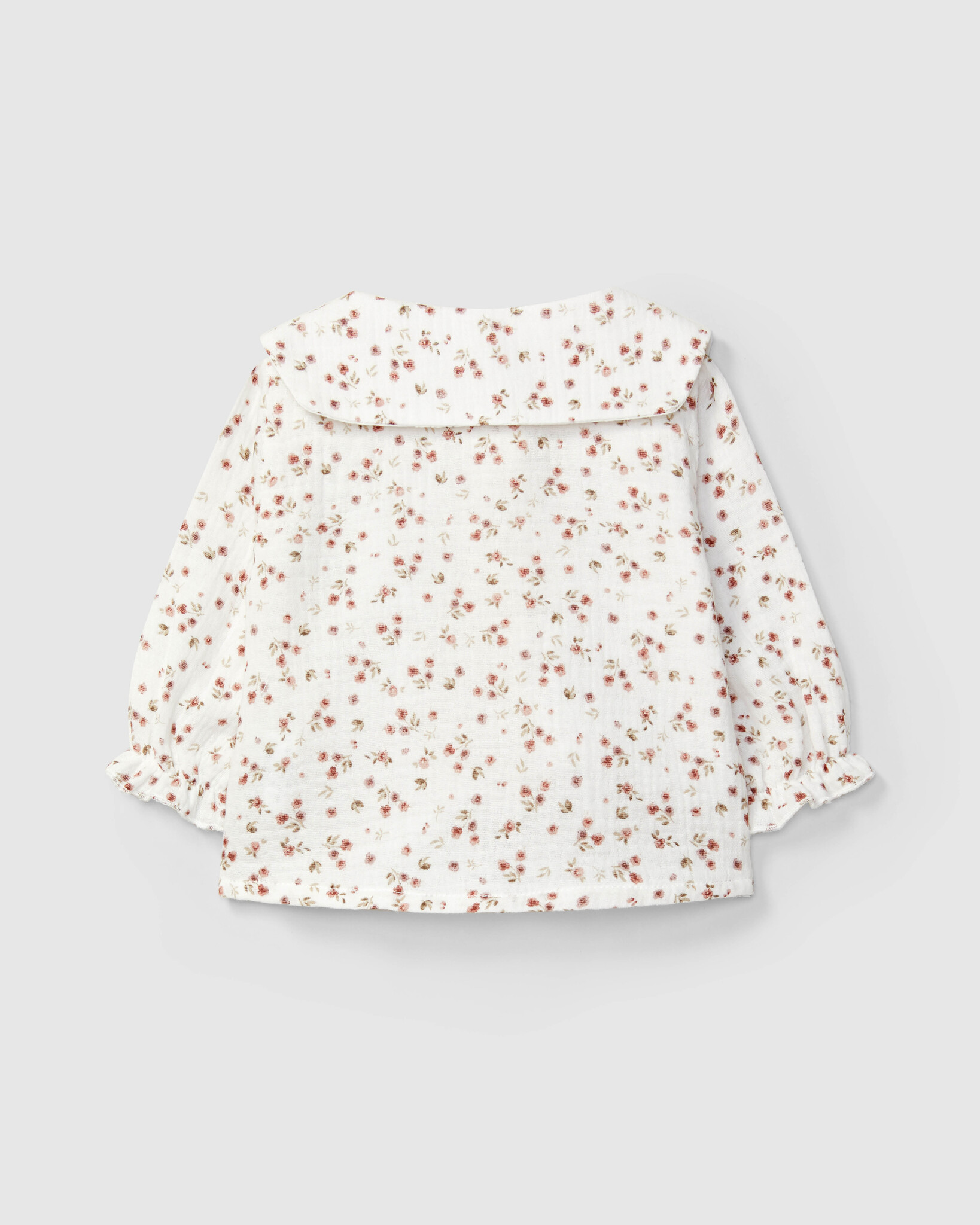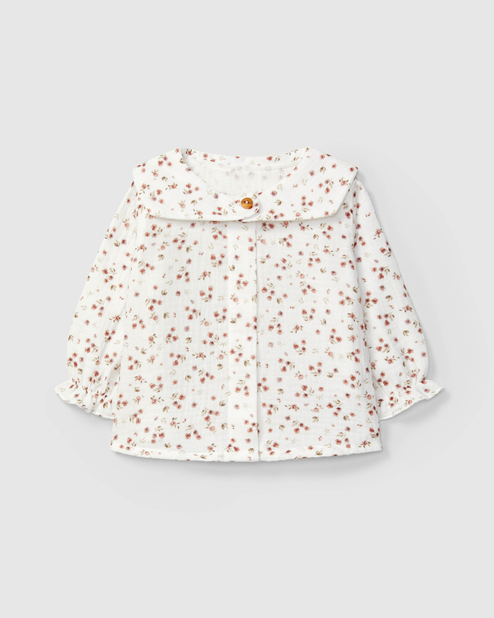 Heel lief bloesje in de kleur Flower Pink van het Portugese merk Snug. Het bloesje is gemaakt van zachte biologische katoen en voorzien van een schattig bloemprintje. Boven sluit het bloesje met een zichtbaar houten knoopje de rest van de knoopjes zit verborgen. Combineer dit bloesje op een leuk broekje of een fijne legging. Ook mooi onder een truitje of vestje door het leuke kraagje.