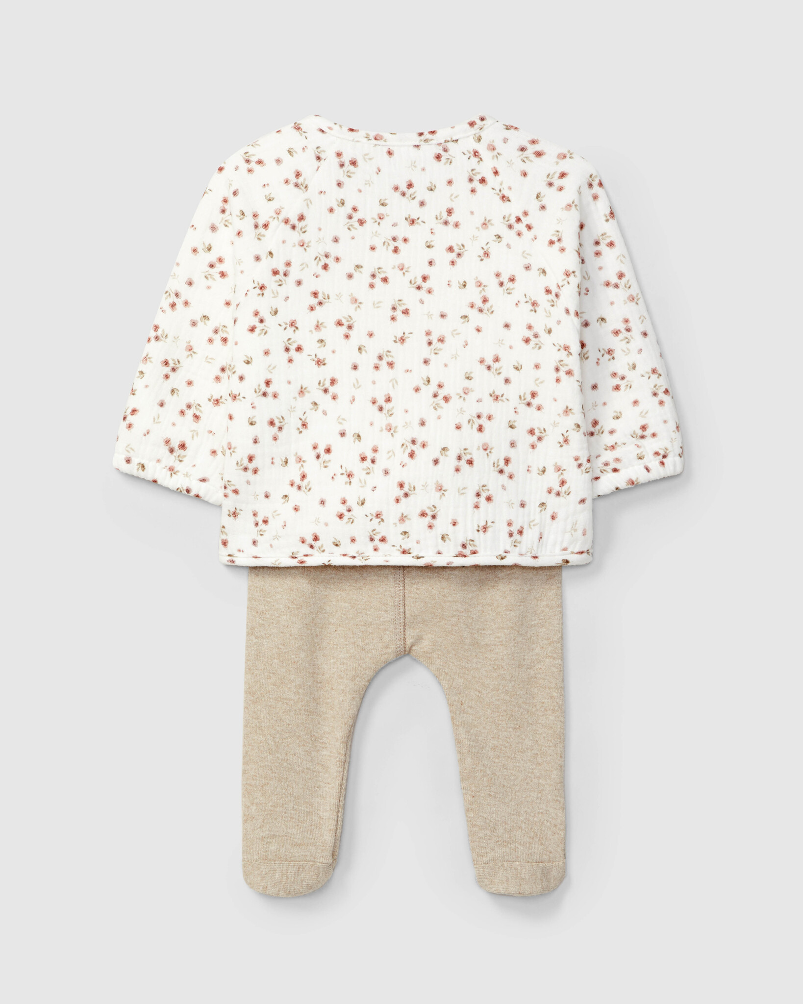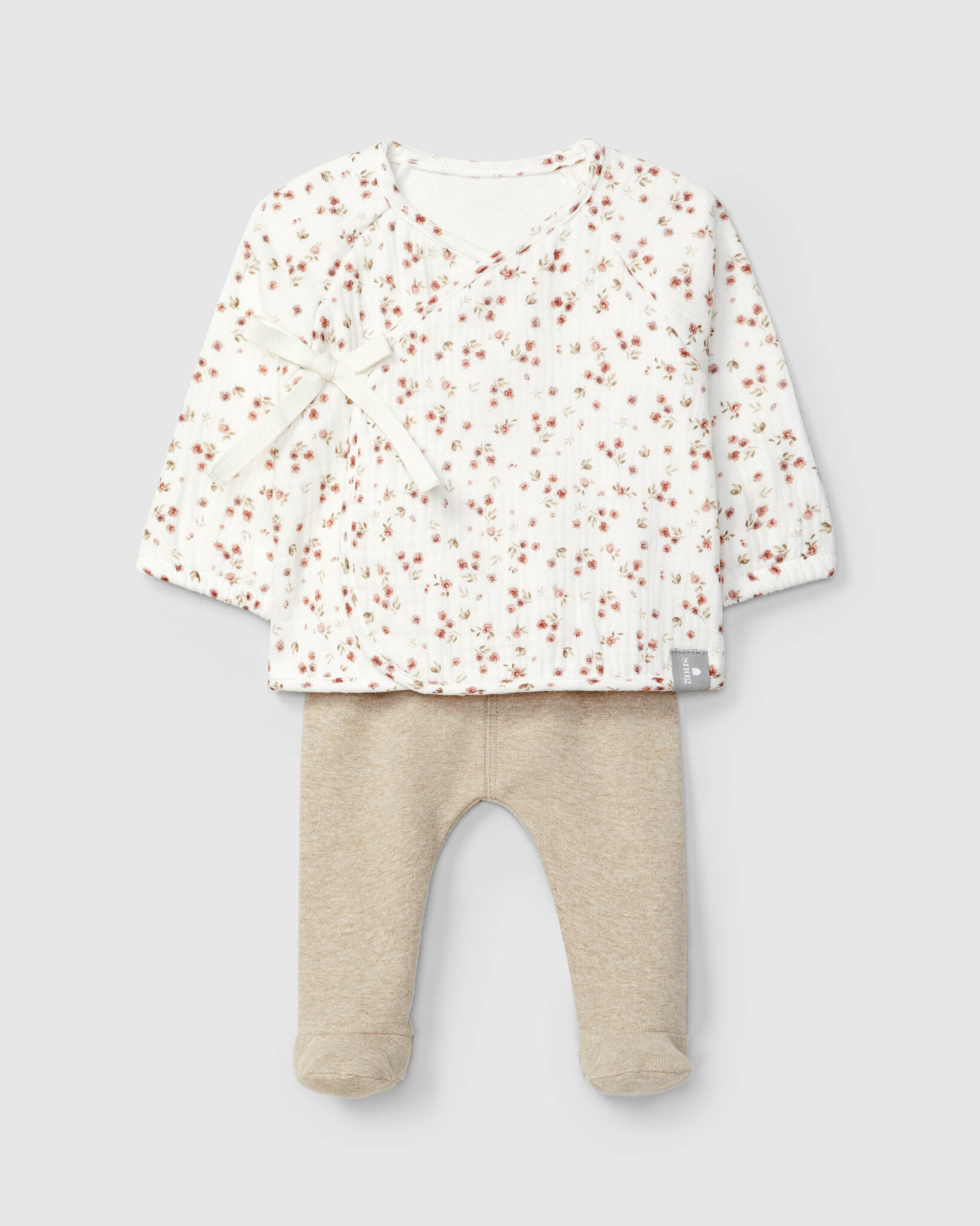 Hele mooie newbornset in de kleur Flower Pink van het Portugese merk Snug. De set bestaat uit een broekje met een mooie wikkeltop. Het broekje is gemaakt van zachte jersey en voorzien van zacht elastiek in de taille. Doordat het broekje voetjes heeft hoef je in de eerste dagen geen sokjes aan te doen. De wikkeltop bestaat uit twee lagen. De buitenste laag is gemaakt van hydrofielkatoen en voorzien van een schattig bloemprintje. De top is gevoerd met zachte jersey waardoor hij heerlijk warm zit. Een echt prachtige newbornset.