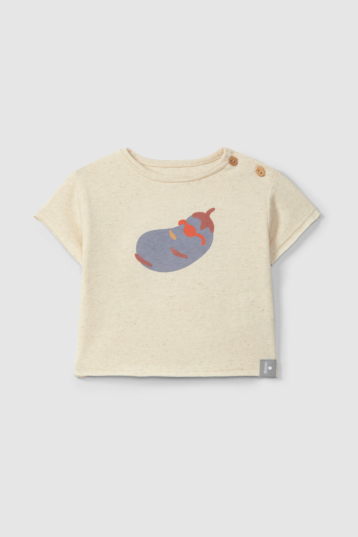 Heel grappig T-shirtje Aubergine van het leuke Portugese merk Snug. Het shirtje is gemaakt van biologische katoen melange en voorzien van een grappige print in de vorm van een aubergine. Het shirtje heeft houten knoopjes op de schouder zodat je het makkelijk over het hoofdje van jouw kindje kunt krijgen. Combineer dit zomerse item met een van de leuke shortjes.