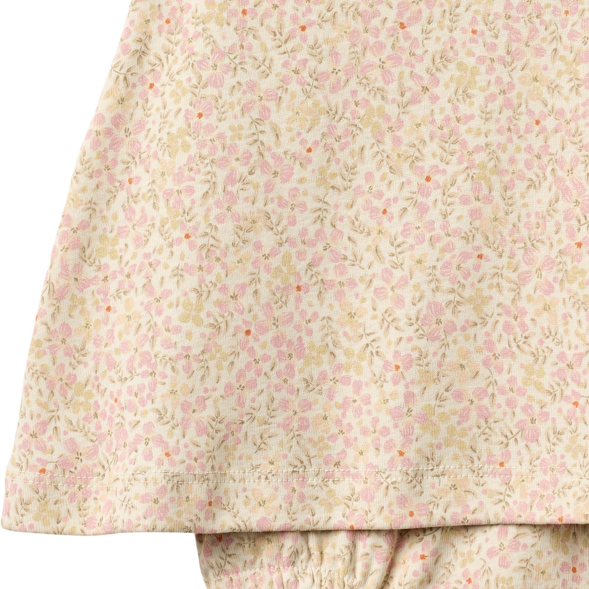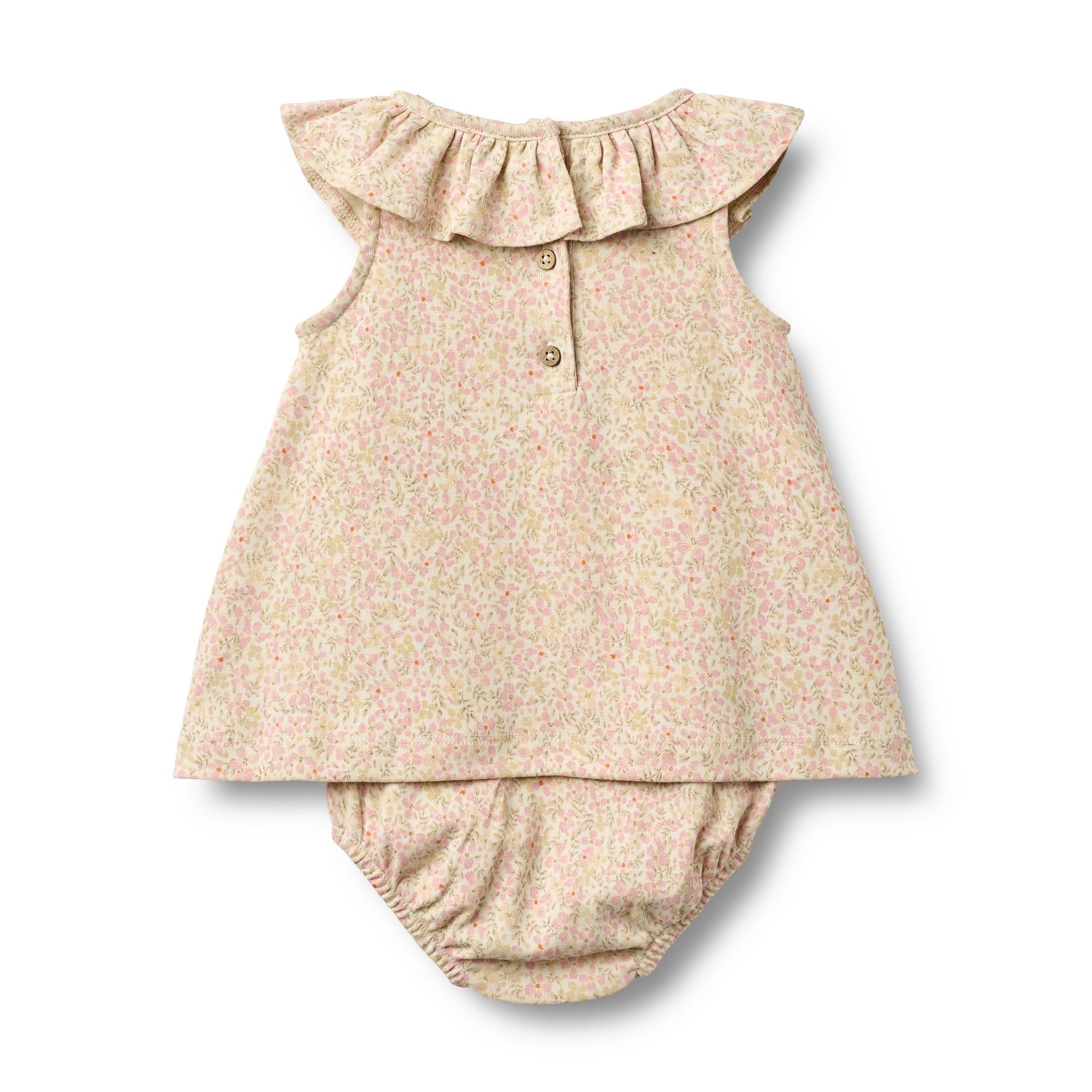 Heel mooi zomers jurkje Ingeborg met de print Coral flowers van het Deense merk Wheat. Het jurkje is gemaakt van biologische katoen jersey waardoor het heerlijk draagt. Onder het jurkje zit een romper van hetzelfde materiaal. De jurk is mooi afgewerkt door het leuke ruche langs de hals. Aan de achterkant zitten kleine houten knoopjes waardoor je de jurk makkelijk over het hoofdje van jouw kleintje kunt krijgen.