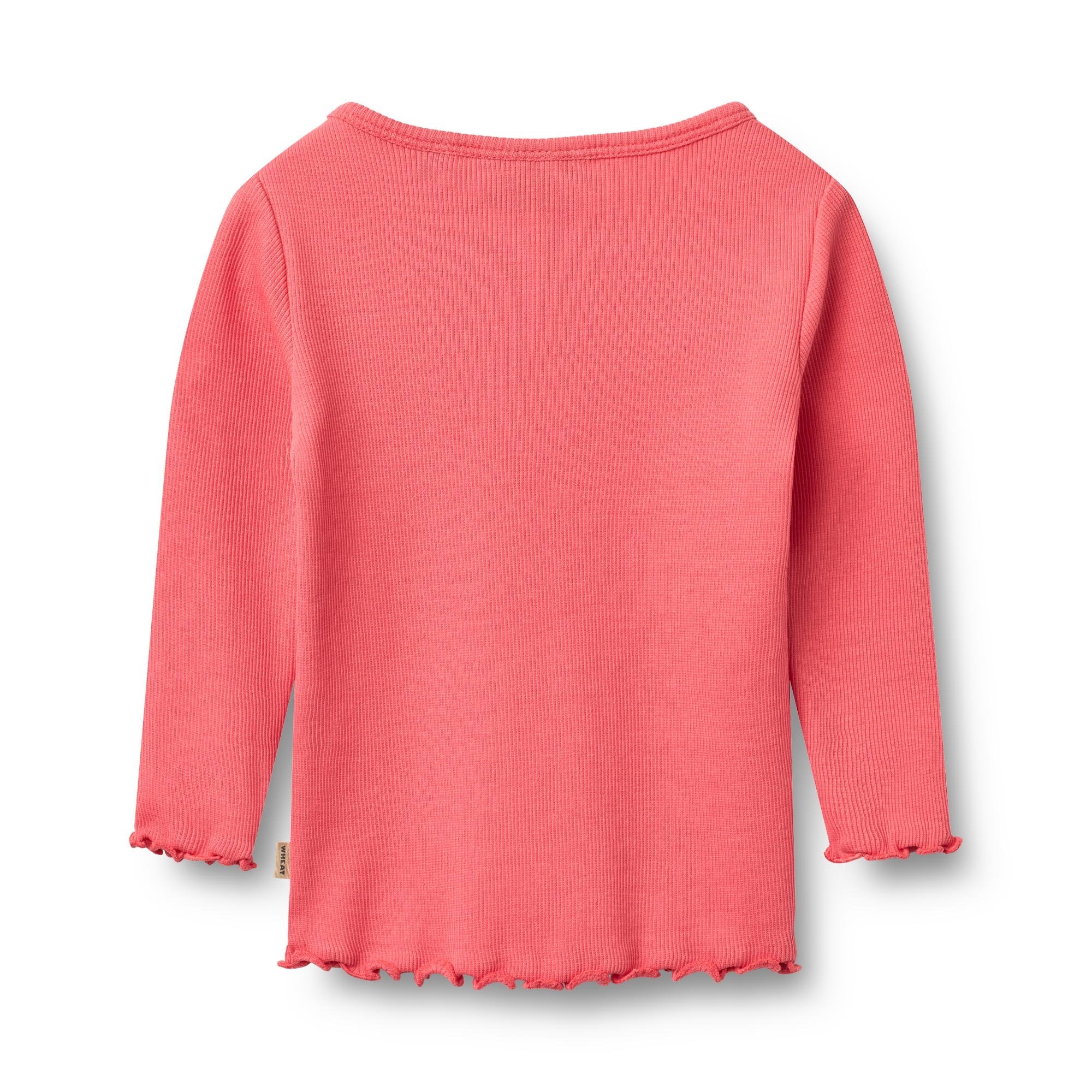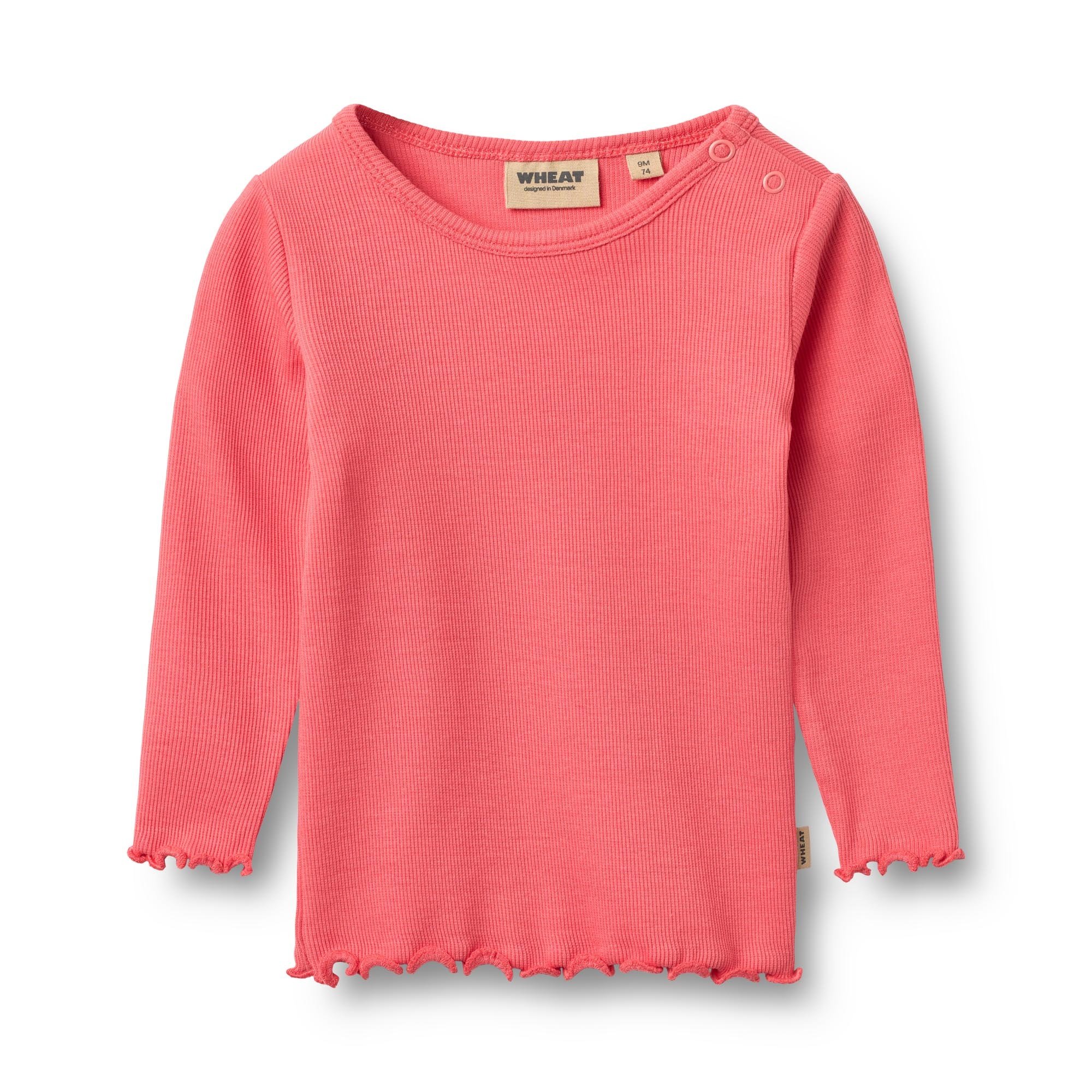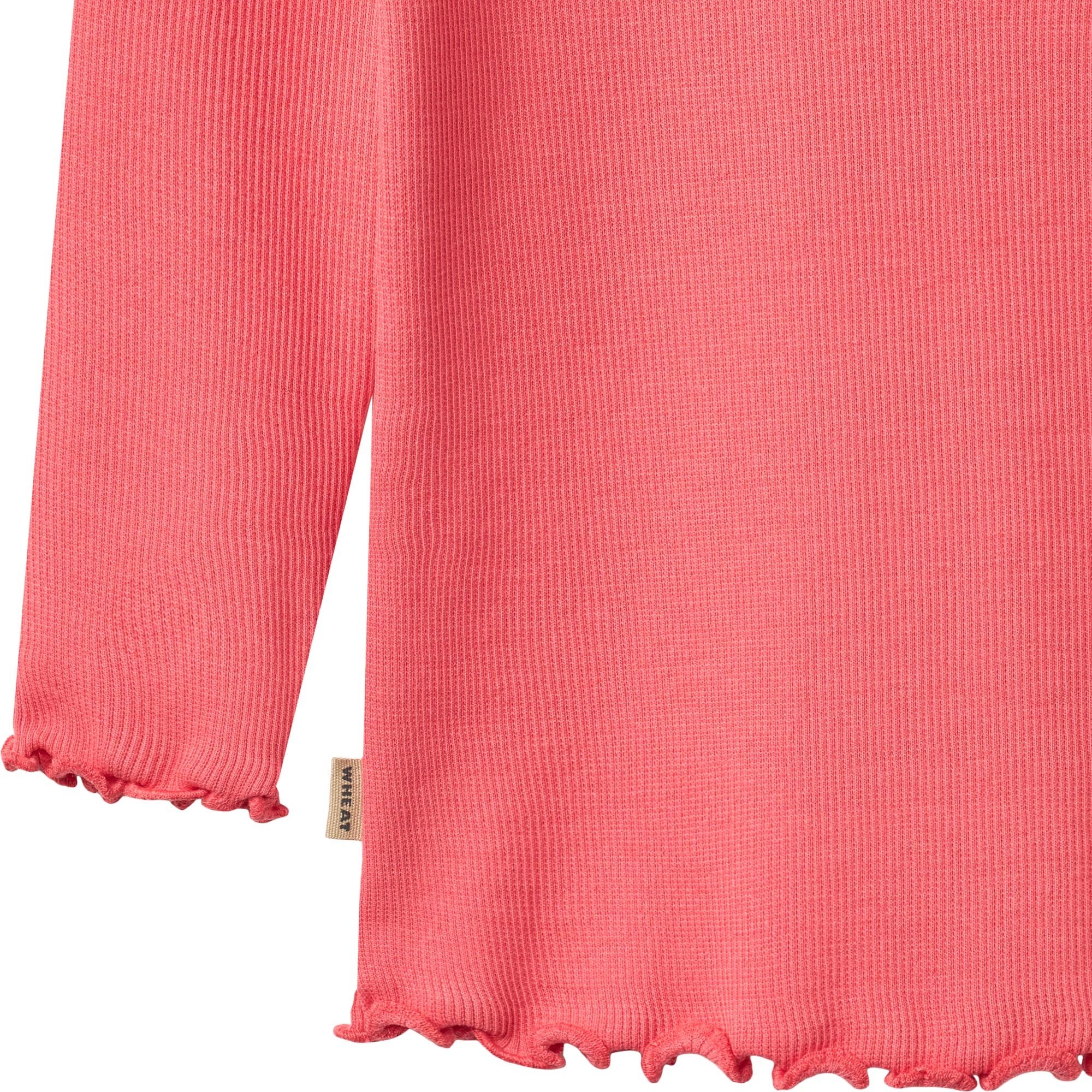 Heerlijk zacht T-shirt met lange mouw Ida in de kleur Watermelon van het Deense merk Wheat. Deze mooie top is gemaakt van een mix van biologische katoen met een beetje elastan. Door de fijne ribstructuur draagt hij heel comfortabel. De uiteinde van de mouwen en het lijfje golven een beetje wat het shirtje een extra leuke uitstraling geeft.